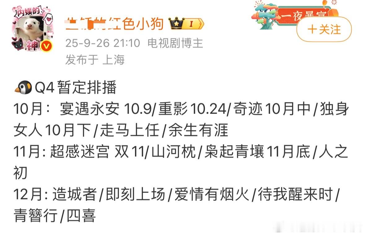 迪丽热巴对接否认枭起青壤小红薯传的还有十天左右播出。很准的排播瓜主几个说的都是11月24日左右,应该就是这两个月了,很喜欢《枭起青壤》这部剧,可以期待下