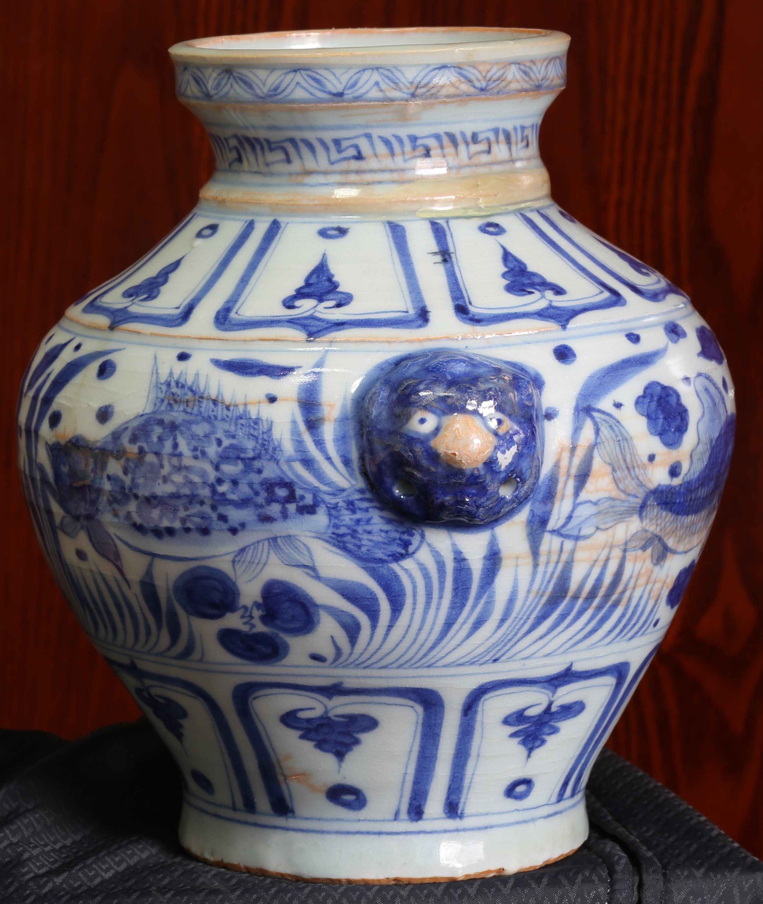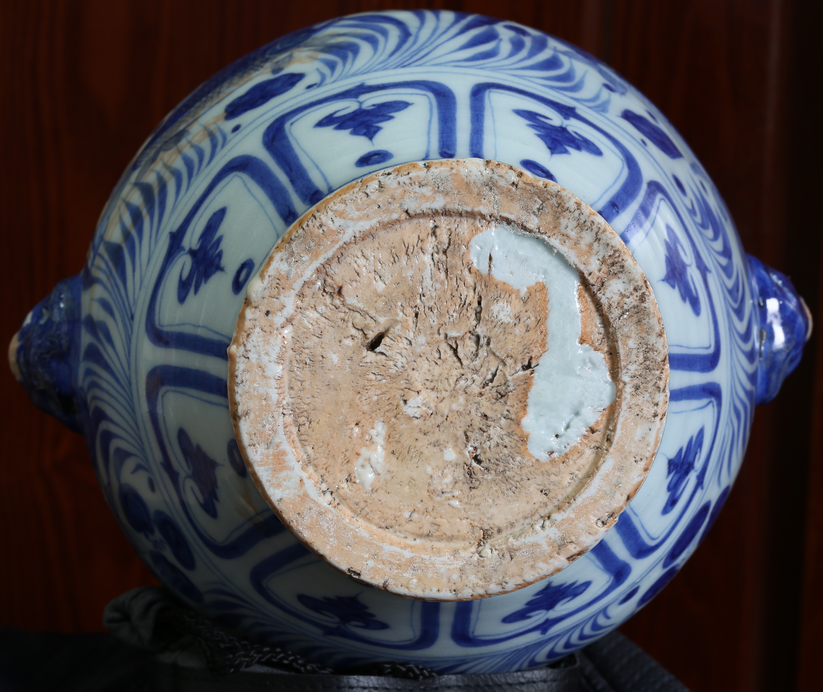 此罐是件开门窖藏出*土的元代景德镇老窑青花古瓷,本器气泡在青花之上,青花下沉,元青花瓷的画工层次参差不齐,差距很大,此物懂元青花的收藏家们,他们是一眼就知是老元青花,底、内膛看火石红自然,麻仓土老胎,接胎工艺成型,苏麻离青钴料发色,都可看出是非常开门的元青花。