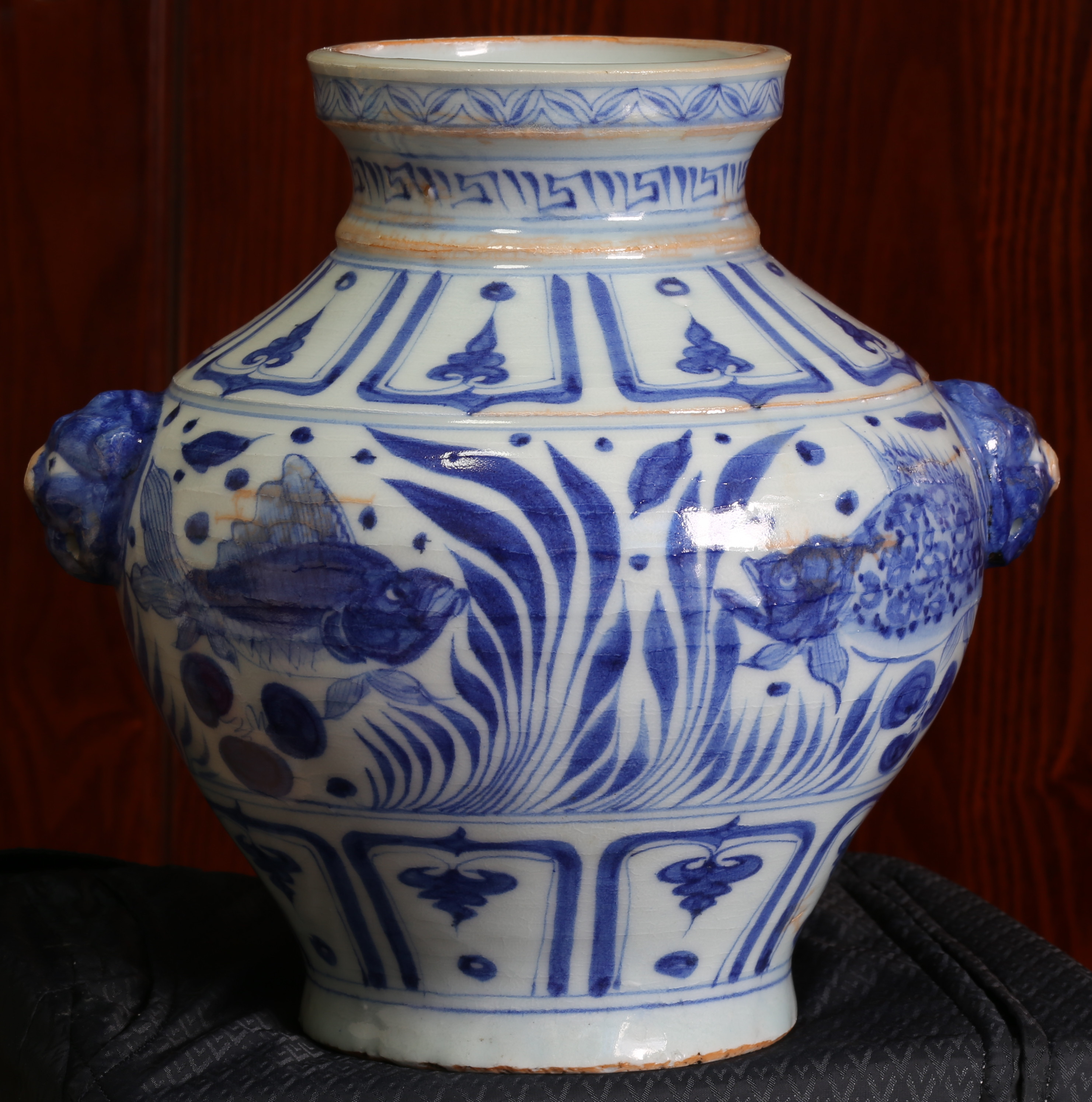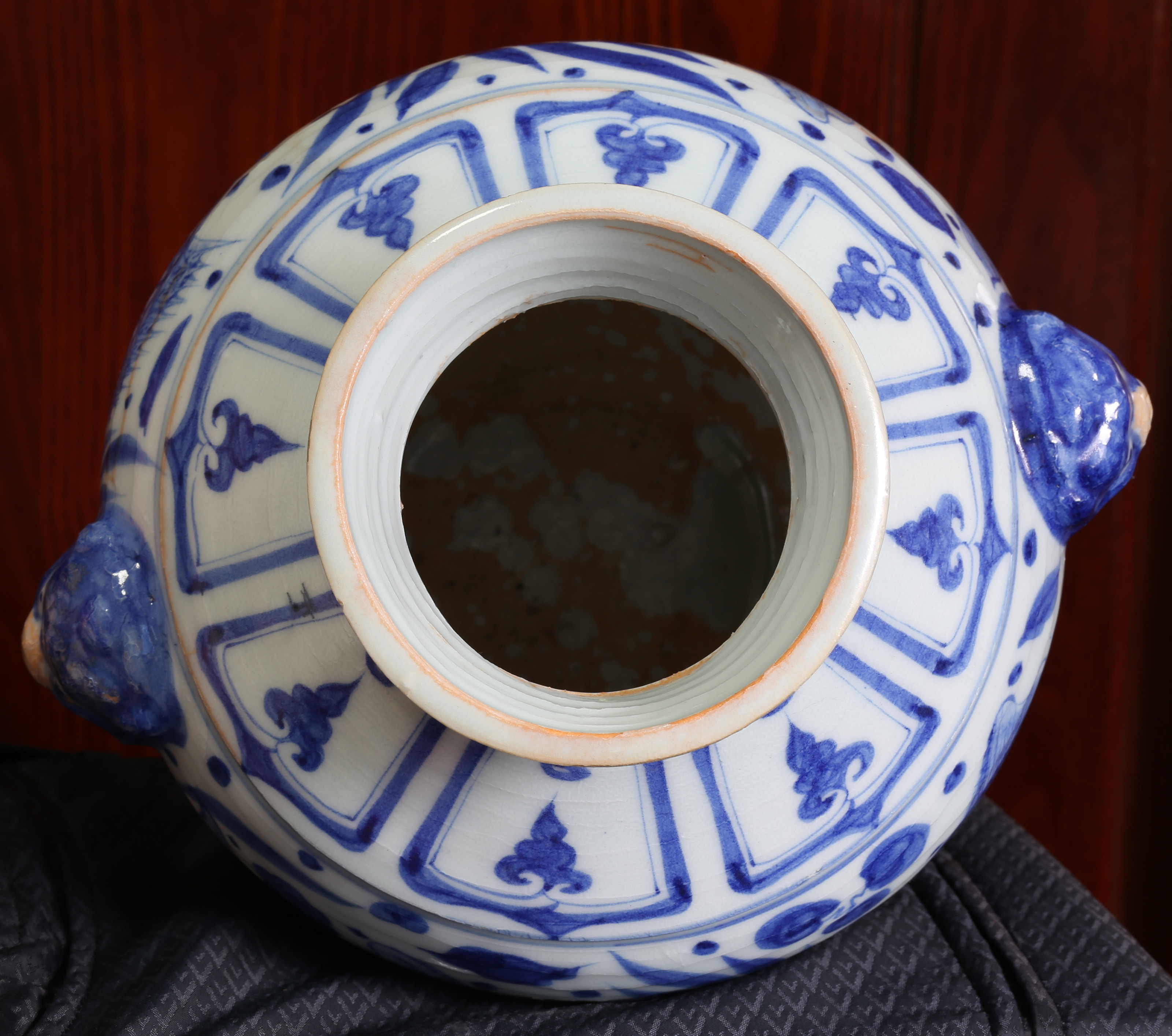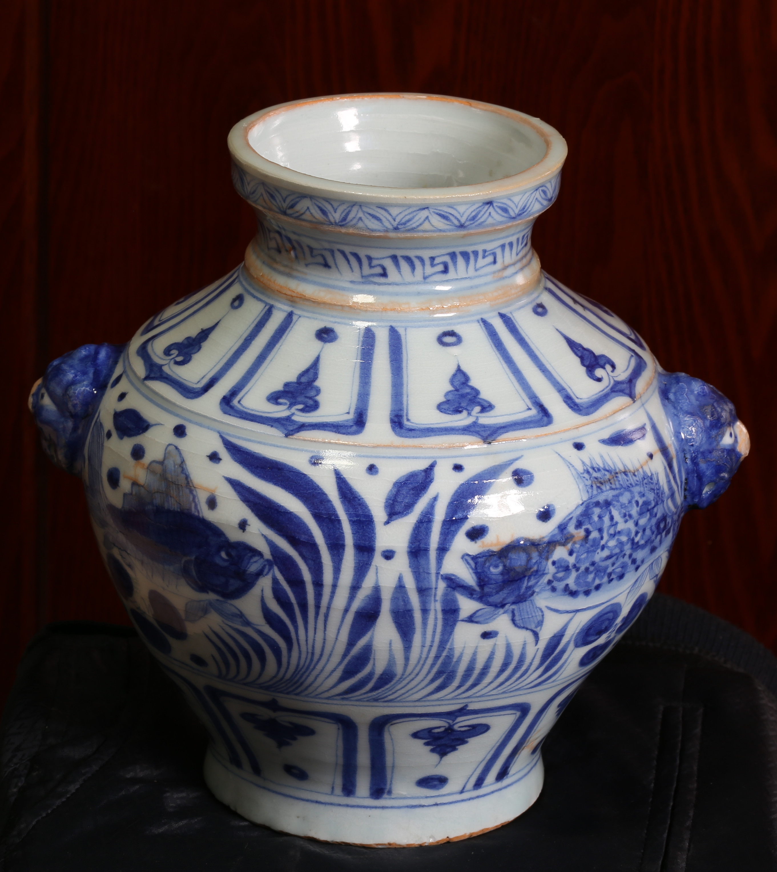 元青花瓷器,稀罕,难得,珍贵文物,价值连城!因此,现在仿制品多,鱼目混珠!本件是件元青花真品。本件元青花古瓷,是一眼货元代景德镇窑青花古瓷,非常开门,我们从包浆啊、古韻啊、老熟感啊、老气感啊、实用痕迹、老化氧化痕迹、纹饰风格、画法、青花钴料、气泡啊、拉胚工艺、艺术效果啊、器型、工艺、老柴木窑烧的微痕特征、缩釉、爆釉、窑裂、窑粘、胎骨、麻仓土、釉料等等方面看,它都是一件开门到代的元代青花古瓷真品。是件真文物、真古物、真古董,真元代青花古瓷。这个罐,整体美轮美奂,美不胜收,实为上品。当为珍藏传世。