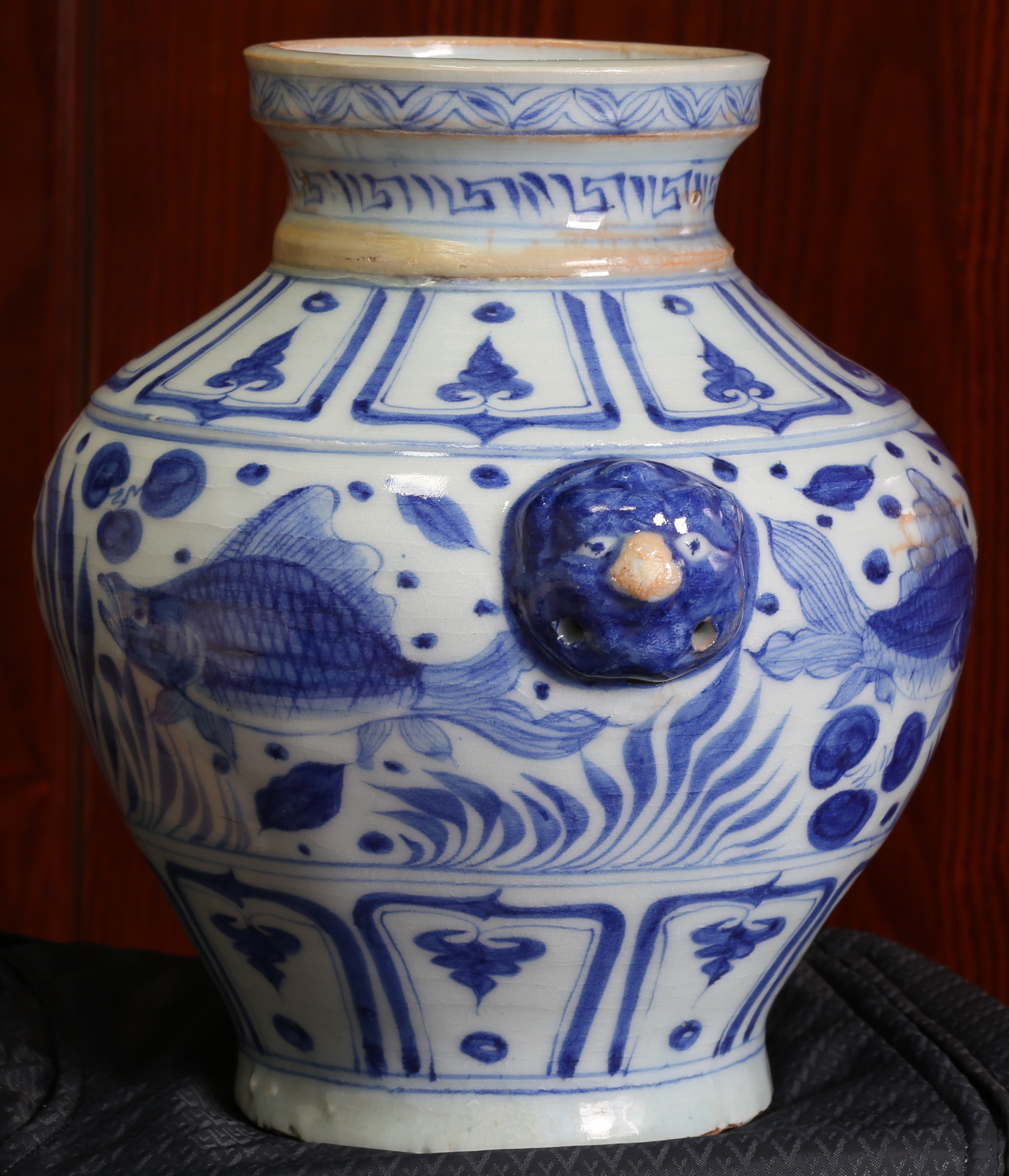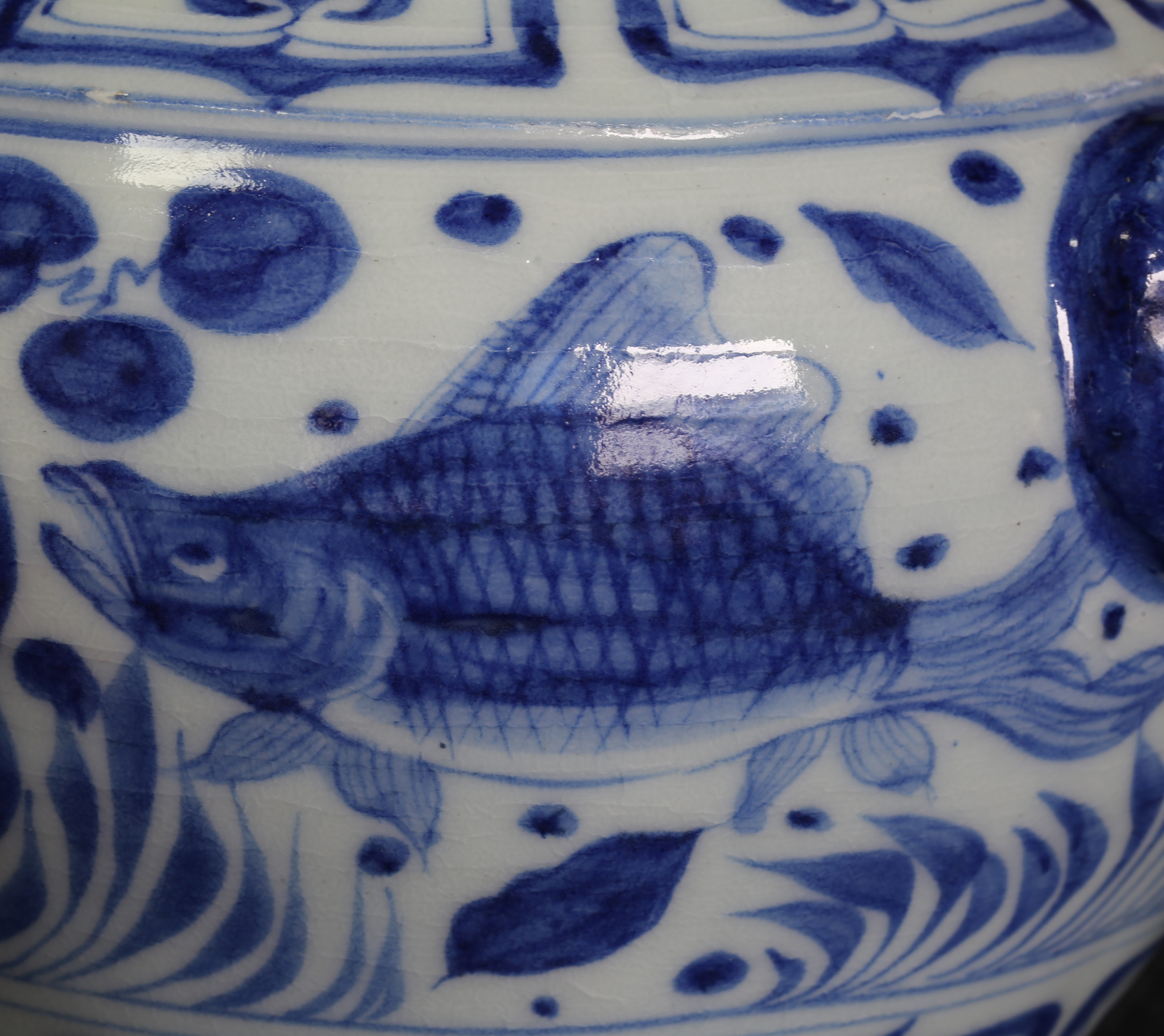 元青花鱼澡纹小罐,开门元青花,包老到元代,发色翠兰淡雅,画工流畅,鱼澡纹非常漂亮,,三层纹饰,非常漂亮。鱼澡纹饰元代常用题材。
