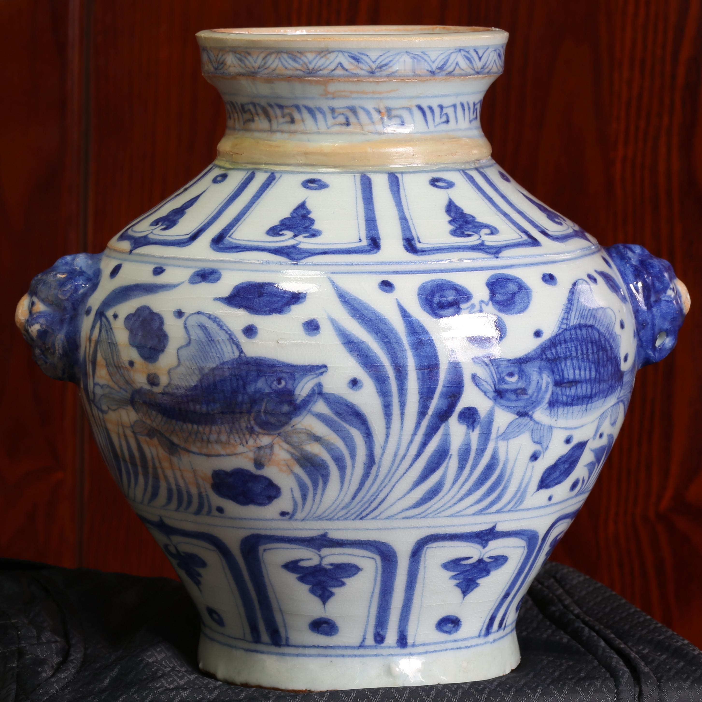 开门元代青花瓷,包老,器型周正。什么叫老得掉渣啊?此件老窑古瓷器元青花经过快700年了,有很多爆釉老化,爆釉老化脆弱得真有扣掉渣的情况。此罐造型优美,线条圆润,雍容华贵,给人以凝重的美感。白釉洁净莹润,青料浓艳幽雅,二者相互映衬。加之遒劲的拓抹绘瓷笔法,使画面有丹青之妙。此件元青花鱼草罐品相好,是元代青花瓷中不可多得的精品,值得收藏。