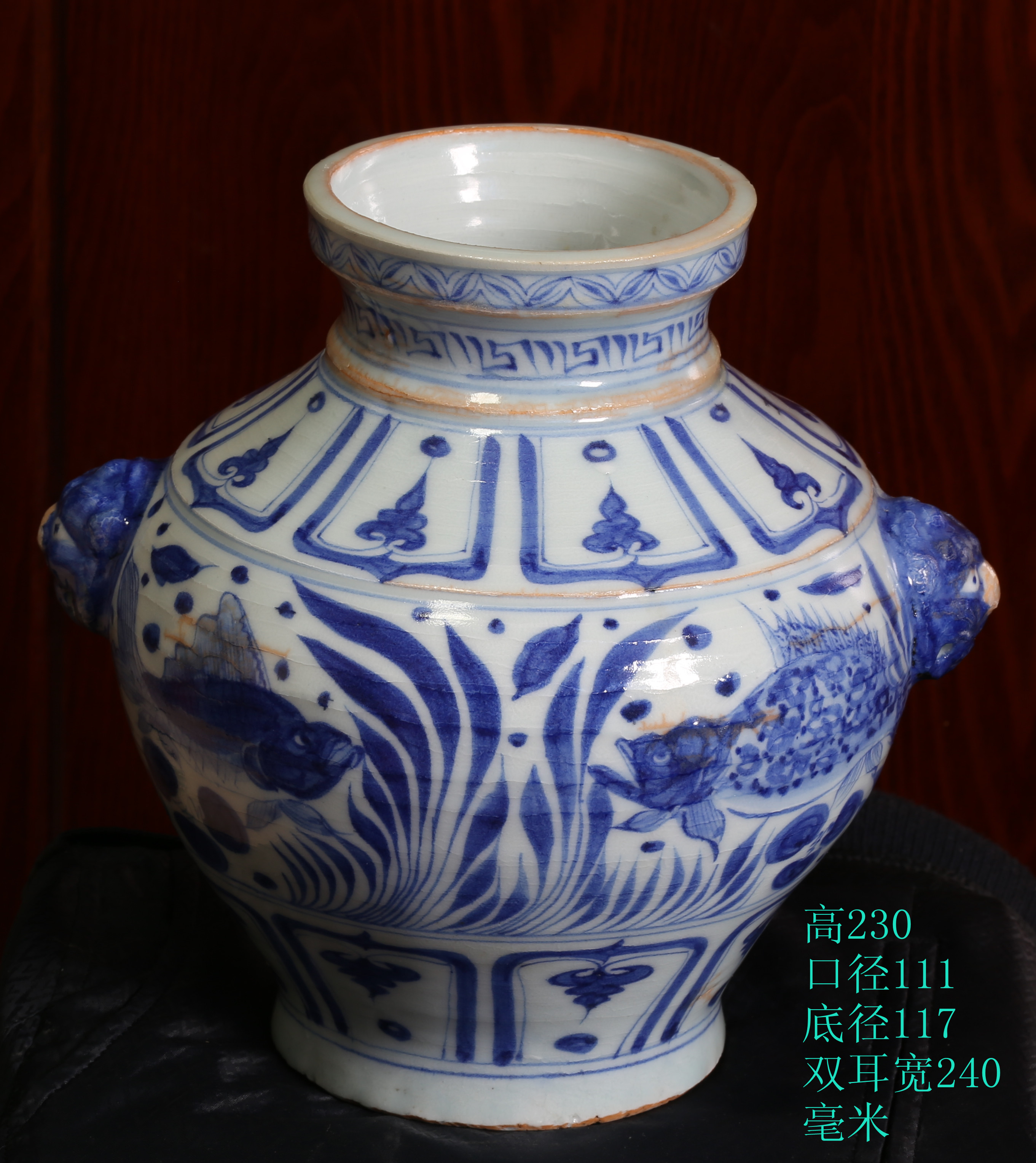 尺寸:高230毫米,口径111毫米,底径117毫米,双耳宽240毫米。