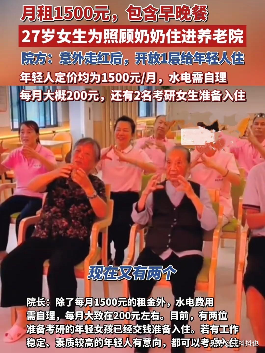 月租 1500,还有早晚餐,浙江养老院成年轻人租房新宠,意外走红了。 近日,浙江一位网友为照顾奶奶,与奶奶一起住进养老院,分享养老院生活的视频一经发出,意外引起众多年轻人的追捧。 因为姑娘说,月租才 1500 元,包含早晚餐哦。上班族白天上班在公司解决午饭,回来有饭吃,还有人搞卫生,干干净净舒舒服服滴。 据该网友透露,养老院是浙江乐清市的,现在住进来的年轻人越来越多,养老院干脆把一楼全部留出来租给年轻人,统一定价 1500 元一月,水电费一个月大概才 200 块。 有网友眼前一亮:青年养老院这个赛道未来绝对能赚钱啊,你看现在年轻人都忙于上班,能有这样的统一打理卫生,还有早晚餐的地方,太适合年轻人了。 的确不错啊,比自己租房子稳定且安全,如果养老院光是老人气氛难免沉闷,加上一些年轻人马上就把气氛搞起来了哟。 这还结什么婚养什么孩子啊,年轻时候使劲潇洒,最后给自己留两年养老钱就行了,性价比太高了吧? 因循守旧不可取,改革创新才有活路哦,看看,养老院变成养青院,一下子就盘活了。 大家觉得养青院前景如何啊?