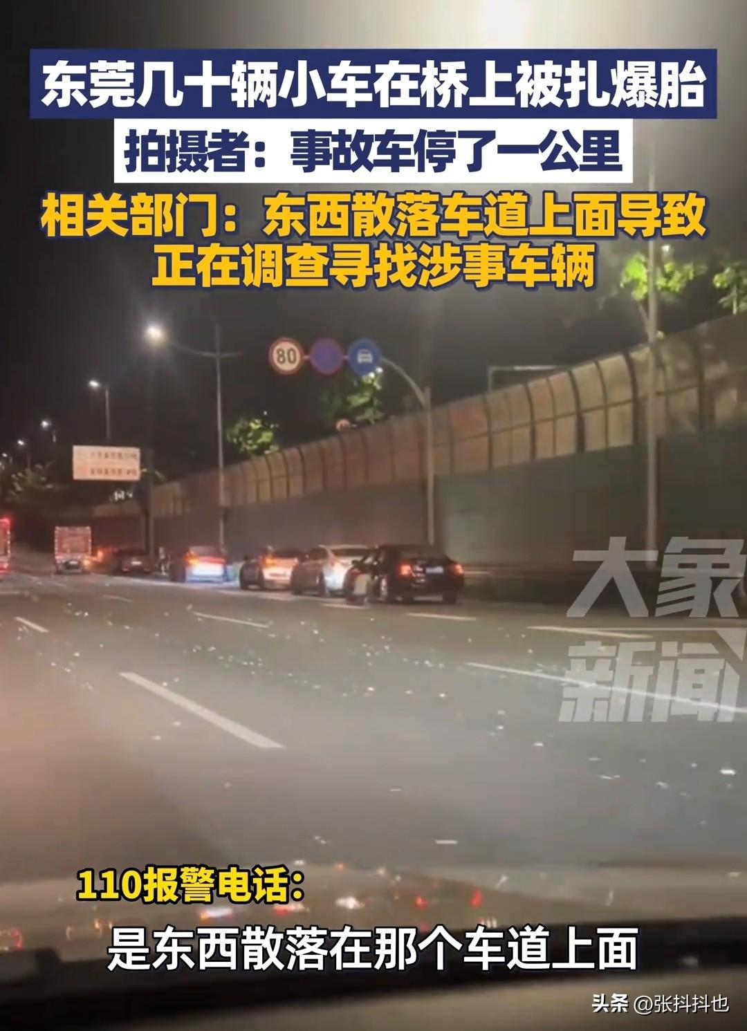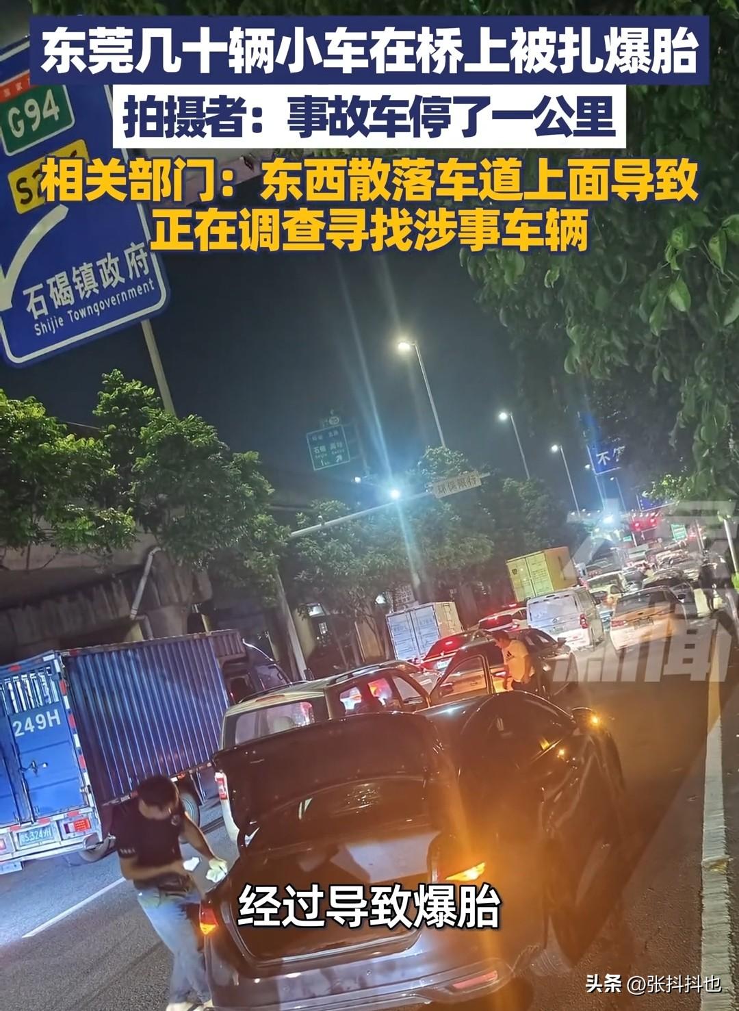 过份!东莞某地大桥事故车绵延一公里,原因竟是桥面上有无数铁渣渣! 近日,东莞有网友爆料,称有几十辆小车在大桥上被铁渣渣扎破车胎爆胎,事故车停了一公里多。 交警部门回应:桥面有渣渣导致的,目前在调查涉事车辆。 有网友建议:如果查不到涉事车辆和人员,方圆2公里内的补胎店每家罚款10万,两公里查不到,就罚五公里以内的! 看样子,网友都很有经验了,有网友含泪述说:莞樟桥附近经常有人撒钉的,一年换几次胎啊。 一次事故,养活了五金店、加油站、汽修店,唯独车主眼泪汪汪,无法理解。 当然也不排除有一些的确是失误, 一些五金类配件掉落下来, 就容易让车主爆胎,希望这次也是这种情况,不然人心就太黑了吧? 马上国庆了,这要不整治,国庆是不是会堵个八天大长假啊?