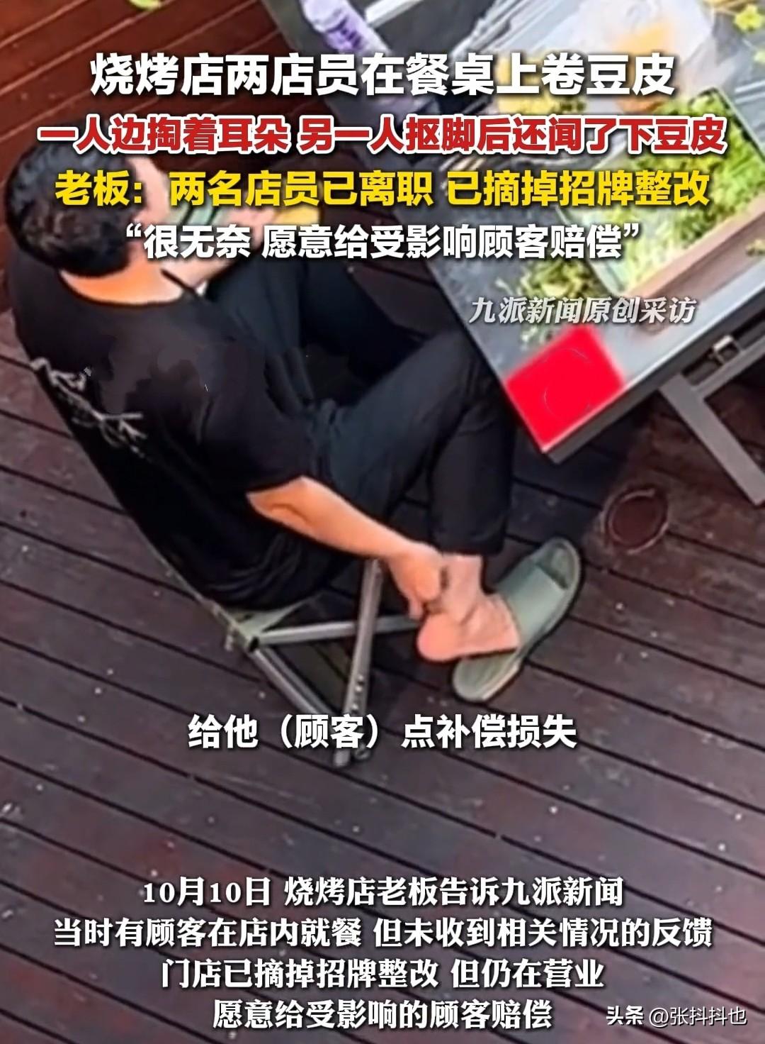 给你一份带味道的烧烤你会吃吗?杭州一烧烤店给出了答案。 近日,杭州有网友爆料,某烧烤店两员工在达到 外餐桌上准备烧烤材料时,一位男子掏耳朵,另外一位则大咧咧地抠脚丫子。其中一位在抠脚丫子后还拿起豆皮闻了闻,这是闻豆皮的味道还是脚丫子的味道呀? 据烧烤店老板说,当时还有其他顾客在店里就餐,但暂未收到相关投诉或反应。目前两人已经离职,店子已经摘牌整改,营业未停。也愿意给受到影响的顾客相应赔偿。 有网友说自己和家人早就不在外面吃东西了,想吃啥都自己做就好了。 还有人说:不要去后厨,不要去后厨,不要去后厨,连说三遍,只因为一去后厨你再也不会想要吃外面的饭菜了。 总结一下,比如说:用抹布擦脚,用洗菜盆洗脚,用羊肉串签子掏牙齿,揉面时用手挠痒痒,上洗手间不洗手继续包包子......简直说不下去了。 很多人说眼不见为净,不干不净,吃了没病,可这眼见了不是不净,是想吐吧? 所以尽量在家吃吧,吃点家常菜,营养又健康。人的素质也很重要啊,特别是对餐饮企业来说,这样的员工,传出去还有哪个顾客敢来吃饭呢?