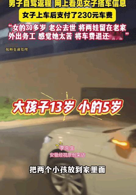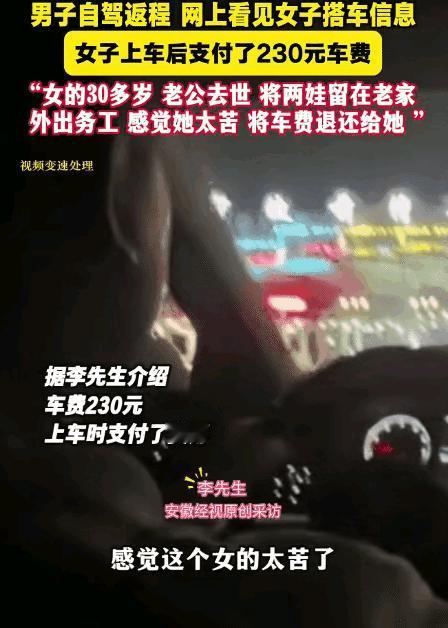 太暖心了!10月12日报道,男子从老家回宁波,接了一单顺风车,乘客是一名女子,上车支付了230块,但女子在车上接了一通电话后,男子把钱退给了女子!男子:“她太苦了!才30多岁,丈夫去世了,她把两个孩子留在家里,自己出去打工赚钱!”。[兔子] 李先生此行是带着家人返回务工地慈溪,为分摊油费,他出发前在顺风车平台发布了行程,系统匹配了一位同路的女乘客,根据平台核定,这单路程费用为230元。 车辆抵达乘客上车地点时,李先生注意到这位女子在与家人道别,行车途中女子接到家人的视频通话,得知其家庭面临的实际困难,她需要独自抚养两个在老家读书的孩子,一个13岁,一个5岁,都在老家生活。   孩子们平时由家中老人照顾,她这次外出,是要返回慈溪的工厂继续工作,维持家庭开支。 一方面要挣钱养家,另一方面又不得不与孩子分离,这种抉择对每个家庭来说都不轻松,而陌生人的善意,有时能给他们带来暂时的慰藉和支持。   李先生自己常年在外务工,深知独自支撑家庭的压力,他理解单亲母亲外出打工的不易,也明白每一笔开支对这样的家庭都很重要。   抵达目的地后,李先生通过平台操作退还了230元车费,这个决定基于他对同行者处境的理解,也体现了务工群体间的相互体谅。 在现代社会,类似的互助行为正以不同形式发生,它们不追求回报,只是源于最朴素的同理心,在陌生人之间传递着温暖。  这件事在网上传开之后,可真是暖炸了评论区! 很多朋友都说自己看哭了,特别是家里有孩子的,最能体会那种离家的心酸。 有网友留言: “我也是个单亲妈妈,看到大哥退钱那一刻,眼泪根本止不住,这种陌生人的善意,真的能记一辈子,是支撑自己走下去的力量。” 大家都觉得,这230块钱,对很多人来说可能就是一顿饭,但对这位妈妈来说,可能是孩子好几天的生活费,这一退,退的不是钱,是救命稻草般的温暖。 在现在这个常常觉得“金钱至上”的环境里,李先生这个举动特别纯粹,让人又相信“人间自有真情在”了。 有网友感慨:“这才是顶天立地的真爷们!这一退,彰显的是我们中国人骨子里的善良和仗义。” 更让人触动的是,李先生说的那句“我赚钱比你容易”。 没有计较自己的油费成本,而是真心体谅对方的不易,这种将心比心的共情能力,被大家夸“格局打开了”。 这其实是“好意同乘”非常温暖的一面,让我们看到了人与人之间超越合同关系的温情 。 生活中有没有哪个陌生人的小小善举,曾经温暖过你? 信息来源:安徽经视