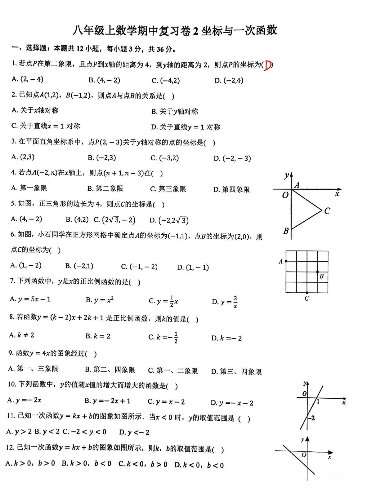 分享一套初二数学上册期中考试复习试卷,这是我自己出的试卷,主要针对数学基础比较薄弱的学生,尖子生可以划过。主要考点是平面直角坐标系和一次函数,对标的教材是北师大版初中数学教材。初中数学 八上数学必刷题 八年级数学试卷 一本【数学压轴题】初中压轴题 一题多解带视频讲解