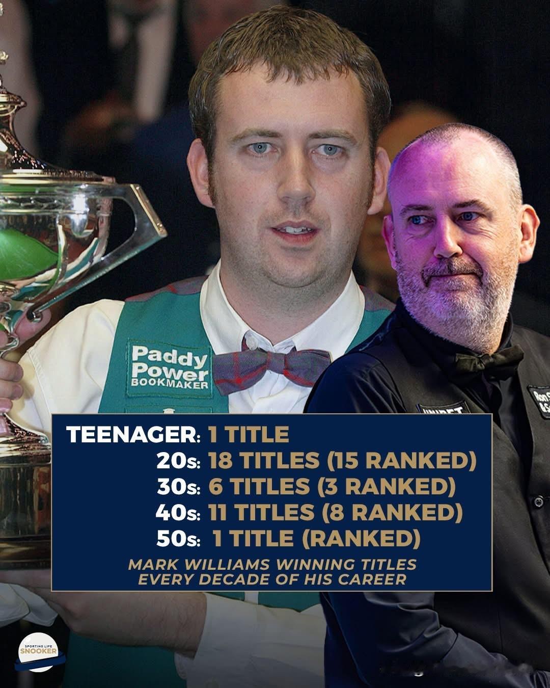 青少年时期:1个冠军 20多岁:18个冠军(15个排名赛) 30多岁:6个冠军(3个排名赛) 40多岁:11个冠军(8个排名赛) 50多岁:暂时1个冠军(排名赛) 马克·威廉姆斯职业生涯每个十年都赢得冠军,真的不可思议,他的稳定性甚至要超过奥沙利文,大家认为呢?