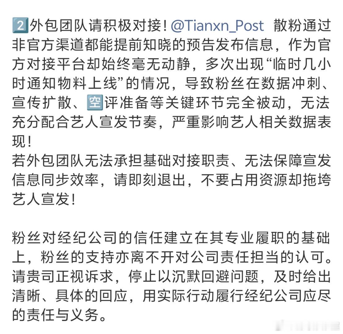 曾多次向公司提出合理诉求但未得到有效反馈,此次针对营业宣发、对接两方面问题进行联合声明。