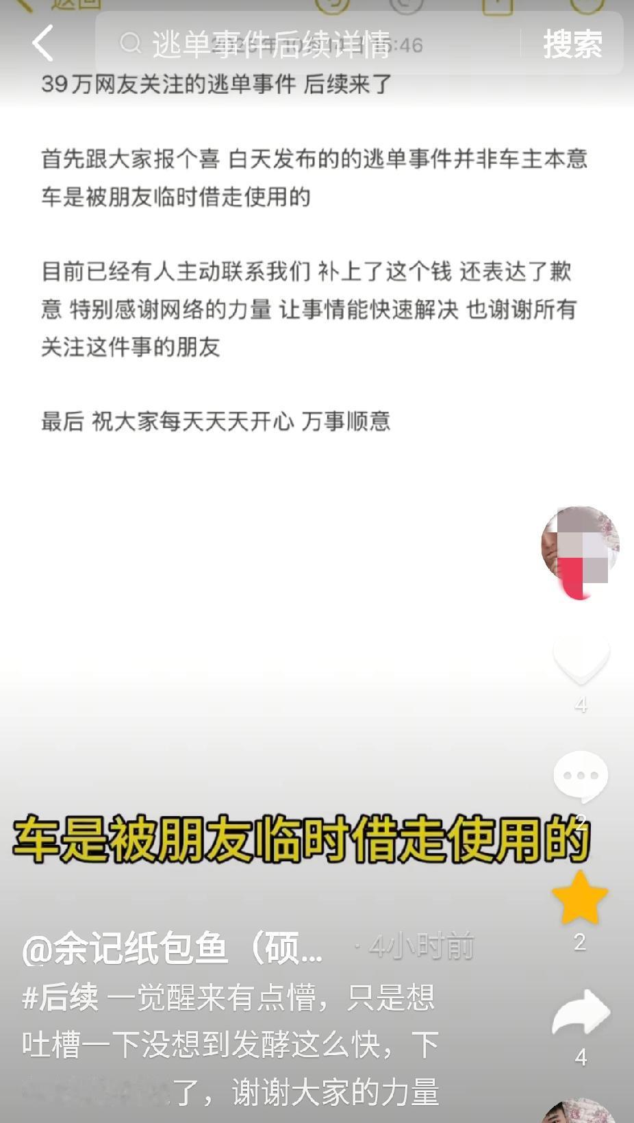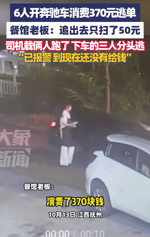 “太丢人了!”江西抚州,6人开奔驰来饭店消费了370块钱却逃单。他们6人吃完饭,陆陆续续走的,并没有主动买单,而老板和店员发现追了出去,他们正要开车走,老板把车拦下,其中3人下车分头跑了。 剩下的人扫码也只扫了50块钱,然后司机就载着俩人直接开车跑了,餐馆老板只好报警。 不过刚刚看到这家餐馆老板发布的最新视频表示: 逃单的这个事情不是车主的本意,车是被朋友临时借走使用的。 目前已经有人主动联系餐馆老板,把320块钱补上了。 没想到结局是这样的,就说吗,6人开着奔驰来下馆子,消费370块钱,却逃单,这370块钱,6个人平均也就出60块钱。 而他们的做法也确实坑了车主,并且逃单本身就是不道德的行为,同时也违法的行为。 因为顾客进入饭店点餐用餐,这便与店家之间成立了事实上的餐饮服务合同关系。 而店家提供餐食和服务,顾客承担支付相应费用的义务。6人用餐后未支付全部款项,构成了违约,侵犯了店家的财产权。 所以店主有权要求这6人承担继续履行,也就是支付剩余的320块钱的餐费和赔偿损失,如追讨餐费产生的合理费用的民事责任。 而这6人的行为是民事违约与行政违法的竞合。 他们不仅需要承担民事赔偿责任,支付所欠餐费,还可能面临公安机关的行政处罚。 如果存在多次逃单等情节,甚至可能被追究刑事责任。 面对这种情况,餐馆老板选择报警,是正确的维权途径。 不过好的是,餐馆老板也把剩下的320块钱餐费要了回来,只是没想到这个结局还真是挺让人意外的,这辆奔驰车的车主不是这6人中一个,居然是借来的车,难怪了。 所以,这事也给大家提了个醒,这车还是不要外借的好,像是发生这种事,车主也受影响。 (来源: 大象新闻)