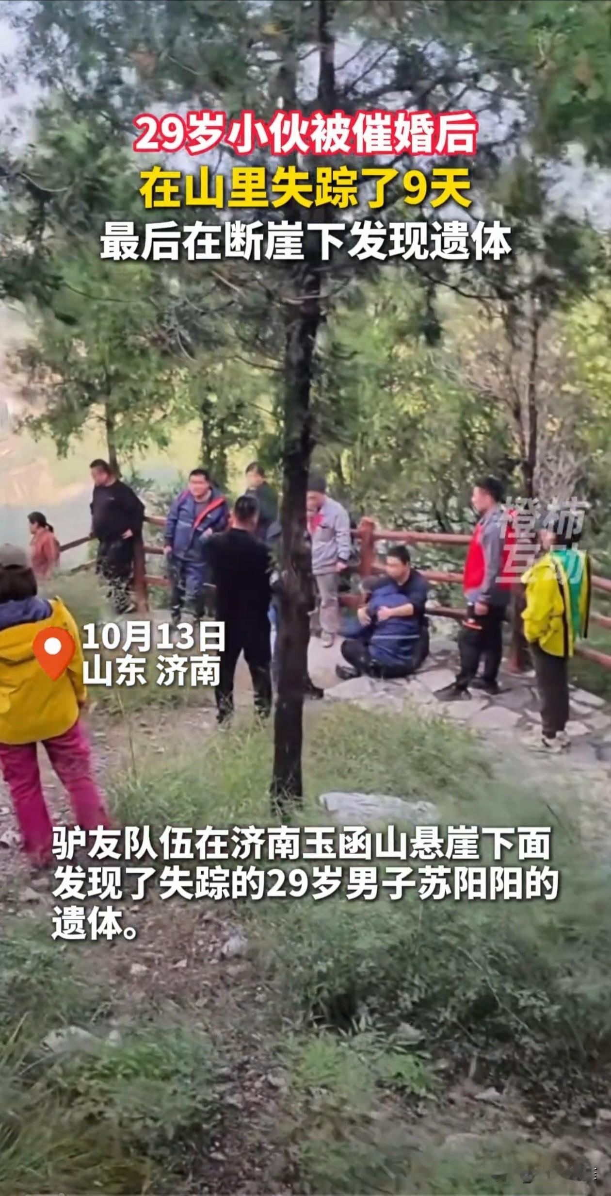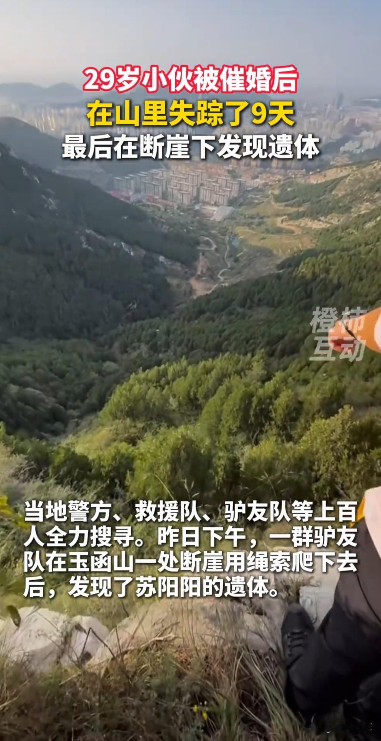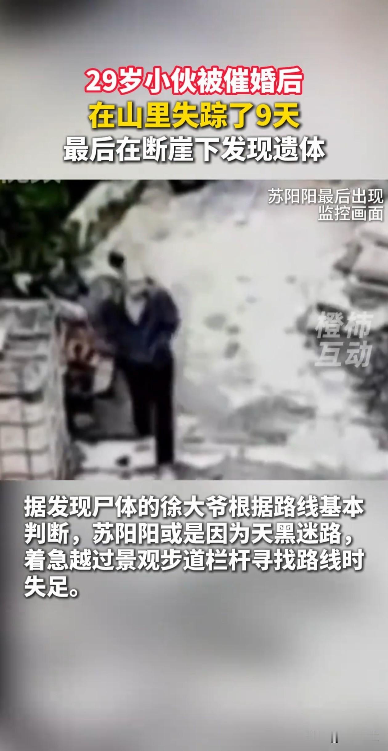 29岁小伙放假回家被母亲催婚,还被说头发长,不注意形象,小伙听完直接在卫生间给自己剃了个光头,之后离家出走,失踪9天后被找到,遗憾的是找到的时候小伙已经离世了。父母当场崩溃,母亲后悔不已:我只是说说而已。 山东,小伙29岁,211大学毕业,在国企上班,工作稳定,性格内向,平时忙着上班,没太多社交,也一直没找女朋友。 他放假回到家,妈妈催他找女朋友,让他早日成家,还因为他头发长,说了他几句,让他注意形象。 他听完什么也没说,走进卫生间给自己剃了个光头,当天下午1点多骑着电动车出了门,之后进了玉函山。 家里人一开始没当回事,直到下午4点多,妈妈给他打电话,发现没人接,最后直接关机了,才意识到不对劲,赶紧报了警。 失联的第9天,一群驴友在玉函山一处崖壁下面发现了他的遗体,离他家直线距离2公里。 驴友根据现场情况推测,他应该是进山后越走越深,天黑后彻底迷了路,着急找方向,想跨过景观步道的栏杆抄近路,结果没踩稳掉下去了。 爸妈得知消息,当场崩溃大哭,妈妈一遍遍喊,我只是说说而已啊,后悔得不行。 有网友觉得小伙是压力太大了,催婚和管头发只是导火索,他只是想找个地方喘口气,没想到成了绝路。 也有网友同情父母,觉得他们只是不懂怎么爱,他们认为让孩子早日成家是为了孩子好,却没注意到孩子的情绪。 父母也是悲剧的受害者,失去了儿子,余生都要活在后悔里。
