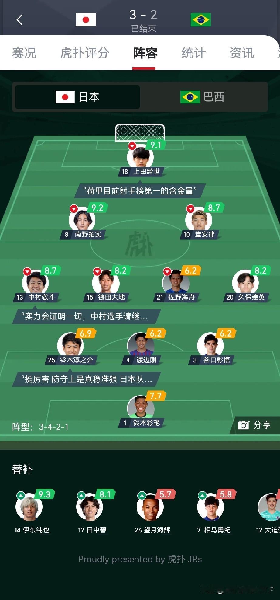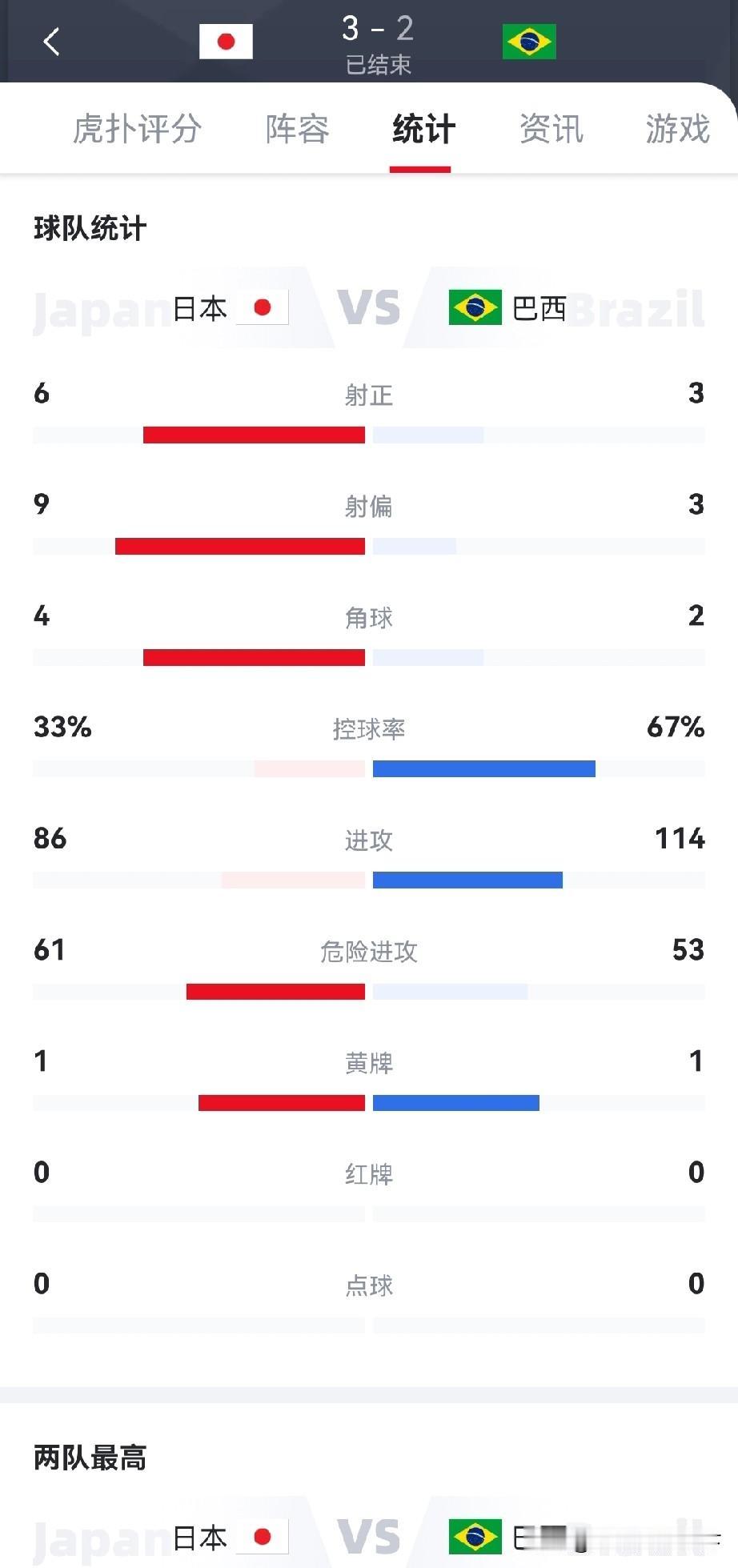 看了直播,日本3:2巴西,两队都是尽遣主力,比赛很精彩,总结如下:1.日本队