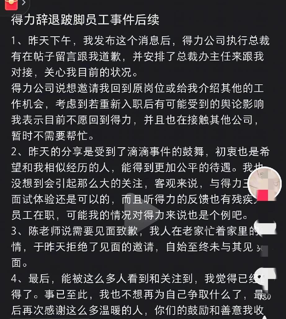 三轮面试通过,入职得力又被辞退?难怪说就业环境差。 这个女孩很优秀,通过了三轮面试而且拿到了通知书,让她去宁波总部报到培训。 入职当天女孩就坦诚自己因为小时候生病腿部有点问题,但并不影响她工作,况且她有七年足够丰富的工作经验。 HR却直接拒绝了她,女孩想再争取一下,提出想跟领导确认,HR打个电话回来就告诉女孩,不能让她入职,还要求女孩写明是自己的原因不能入职…… 三轮面试难道都没问到女孩的腿部问题吗?为什么在她通过面试之后,入职了又拒绝?明明是公司的问题却硬要女孩说是自己的问题? 直到女孩的帖子引起关注,得力方面才出现,可能是迫于舆论,也可能是其他原因,又邀请女孩回去工作。 不过当事人拒绝了,我觉得干得挺漂亮的,她有足够的能力,不收她是公司的损失,而不是她的。 国外努力推行上四休三,国内一周七天都嫌少,甚至辞退面试通过的人,真不知道说什么了。 面试踩坑
