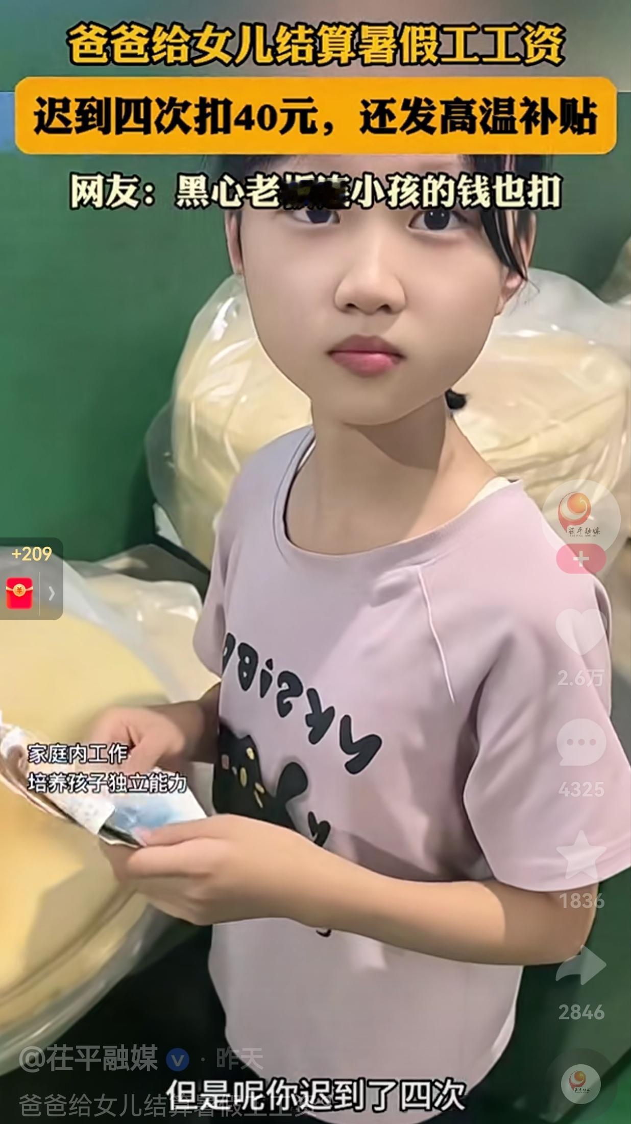 太黑了!暑假期间,爸爸为了锻炼孩子的独立能力,让孩子在店里帮忙。但是呢?孩子不愿意帮忙,就一个劲的在家里玩,怎么办呢?爸爸就想着给孩子一点辛苦费,这样一来孩子的主动性就提高了! 你还别说,当孩子听到爸爸给她发工资的时候,她兴高采烈地就愿意干活了!爸爸和孩子商议,一天给孩子十块钱。 就这样孩子一共干了16天,就到了开学的季节。 开学前夕,爸爸给孩子发了160元的工资,但是呢?孩子迟到了四次,每次扣除10块钱,一共扣了40块钱。 孩子觉得爸爸有点黑心,然而,爸爸早已经想好了对策。爸爸说:“你要是在外面上班的话,每次扣50元呢?我这才扣10块钱,已经够好的了。” 就这样,爸爸又从这160元里面拿了40元。 为了鼓励孩子继续干活,爸爸又给孩子发了10块钱,还说这10元钱是高温补贴呢? 爸爸知道女儿爱钱,过了一会儿故意对女儿说:“别干了,今天先把你的工资结了。你弟弟听说你挣钱了,他也要给我干活。他还说只要给他8块钱,他都愿意干,你说我该让谁干呢? 女儿一听,弟弟要跟她抢活干,再一想自己以后没有钱赚了,也降低了工价,跟爸爸说自己一天8块钱也可以干。 不得不说,爸爸的心,不是一般的黑,为了降低工价,真的是专坑女儿,实在是太黑了! 网友看到后评论说,爸爸此番是为了让女儿提前感受到社会的黑恶吗? 还有的网友说,天天上一当,当当不一样,这叫提前积攒社会阅历,等到孩子进入社会,就不会被人欺骗了。因为,孩子已经提前经历过了,知道该如何维护自身的合法权益了! 虽然看似是拍段子,但是,却反应出社会底层员工的心酸。社会上有多少这样的老板,为了压榨底层劳动力,想办法压低工价,想方设法扣除员工工资。员工为了生存,不得不接受现状。 大家觉得呢?欢迎大家评论区讨论留言。