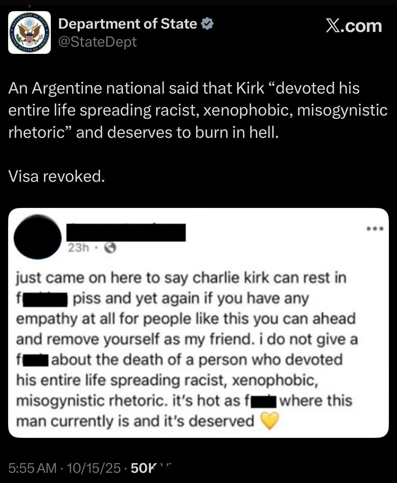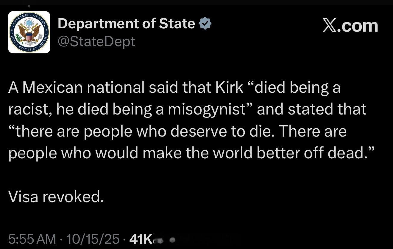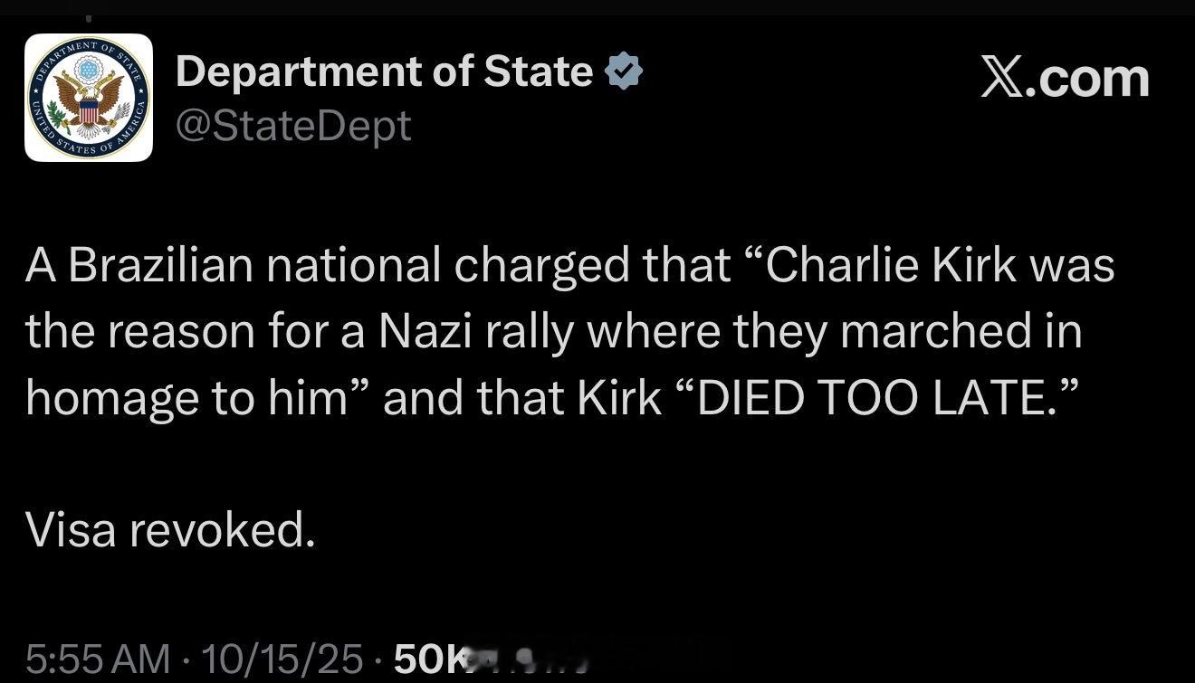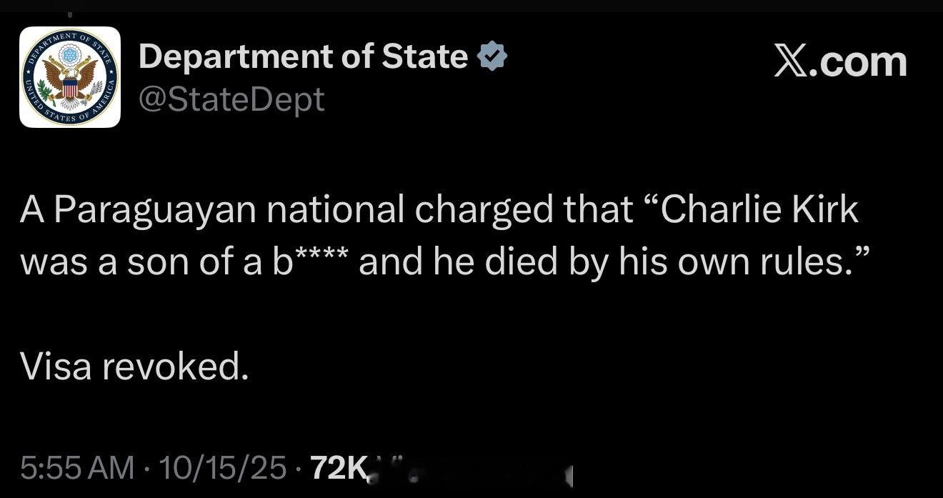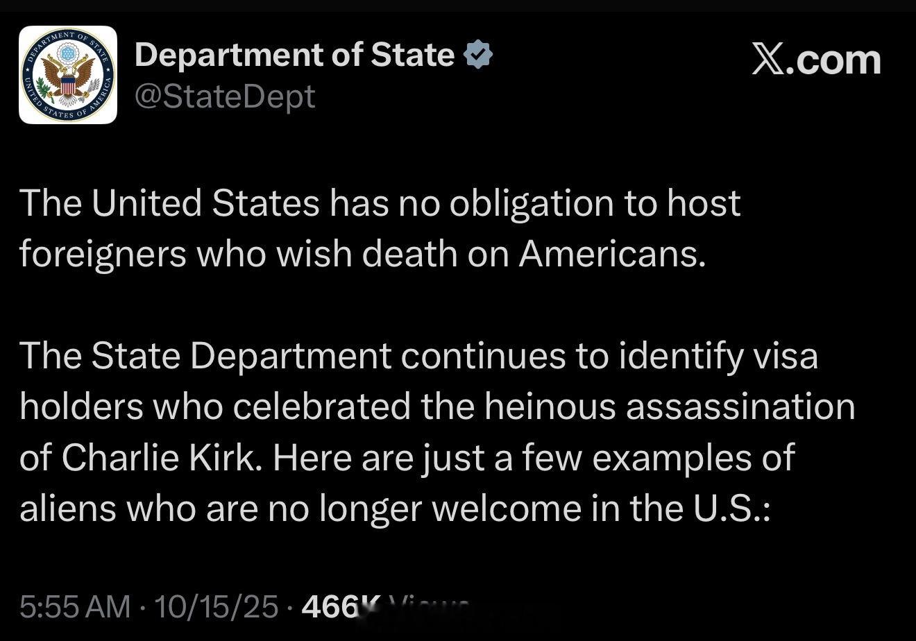 国务院正在持续甄别那些在Charlie Kirk被残忍暗杀后公开叫好的签证持有人。以下是几名已被列为不受美国欢迎的外国人案例: