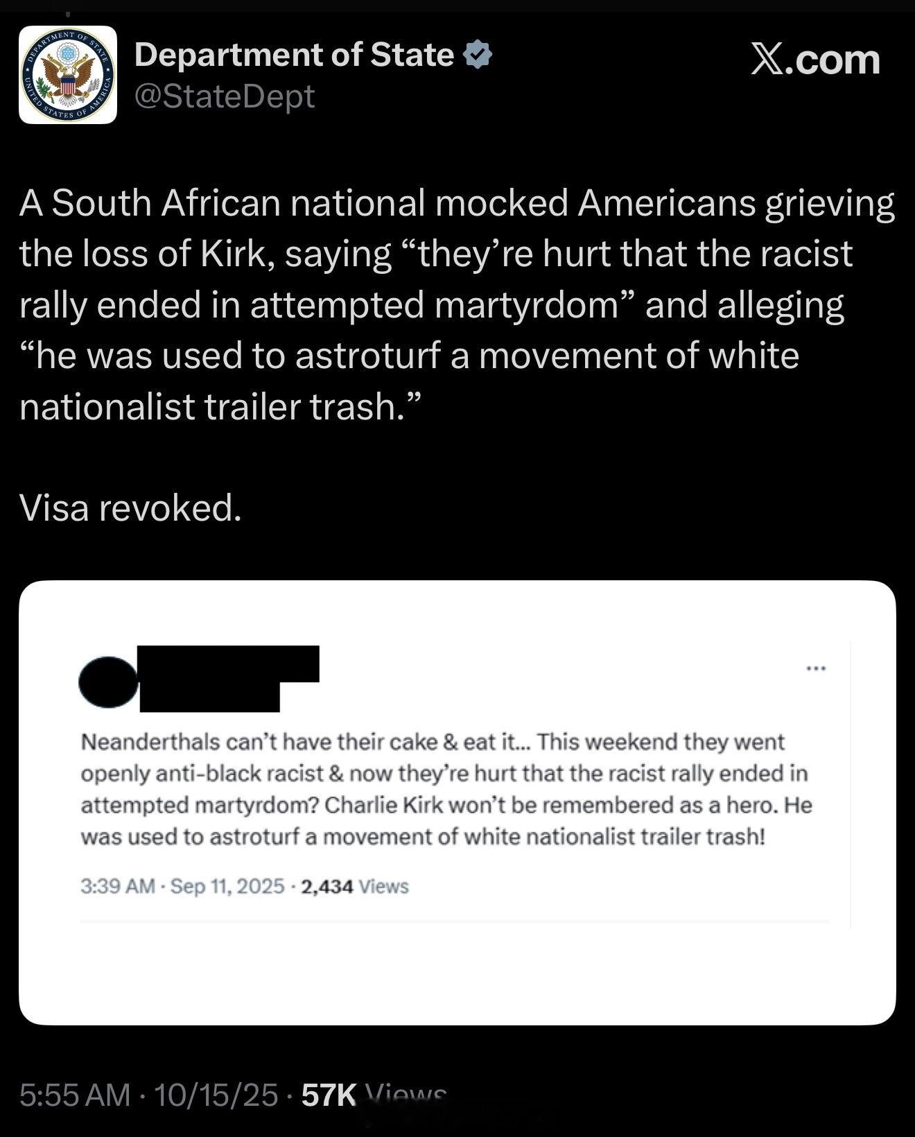 一名南非公民嘲讽那些为 Kirk 之死感到悲痛的美国人,说:“他们只是因为那个种族主义集会以一次假殉道收场而受伤罢了。” 并声称 “他只是被利用来伪造一个白人至上底层群体的运动。”