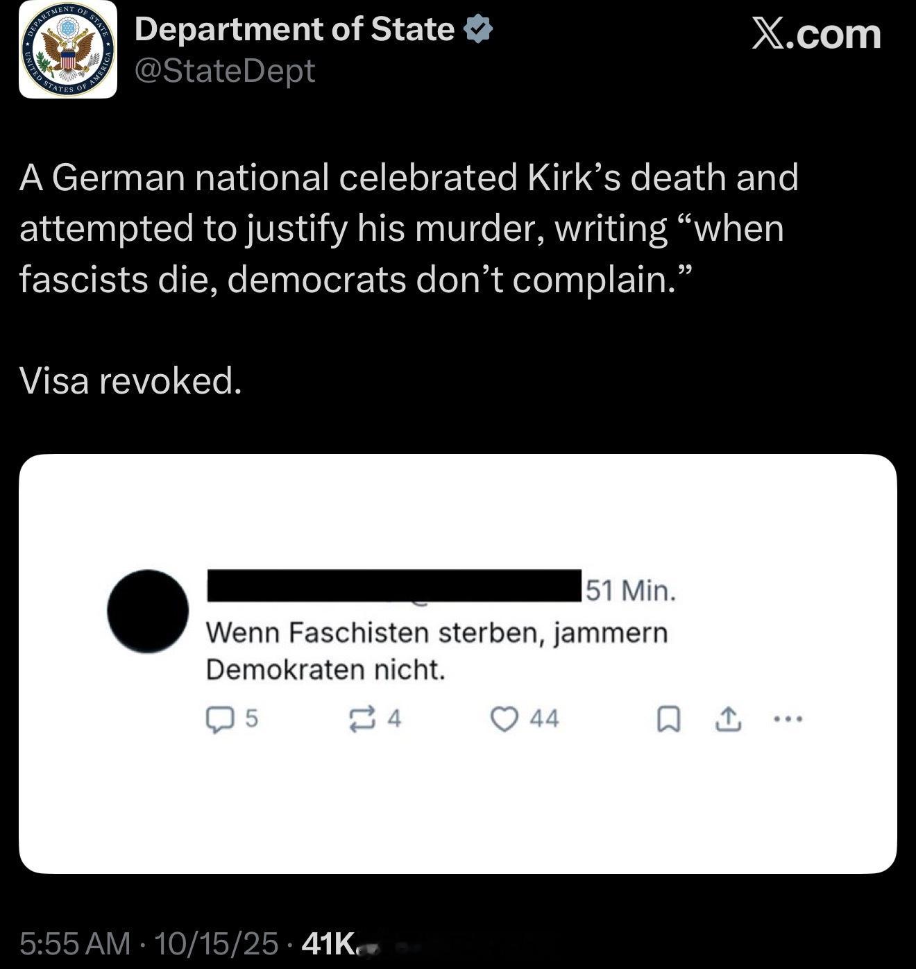 一名德国公民庆祝 Kirk 的死亡,并试图为他的被害辩解,写道:“当法西斯死去时,民主派不会抱怨。”