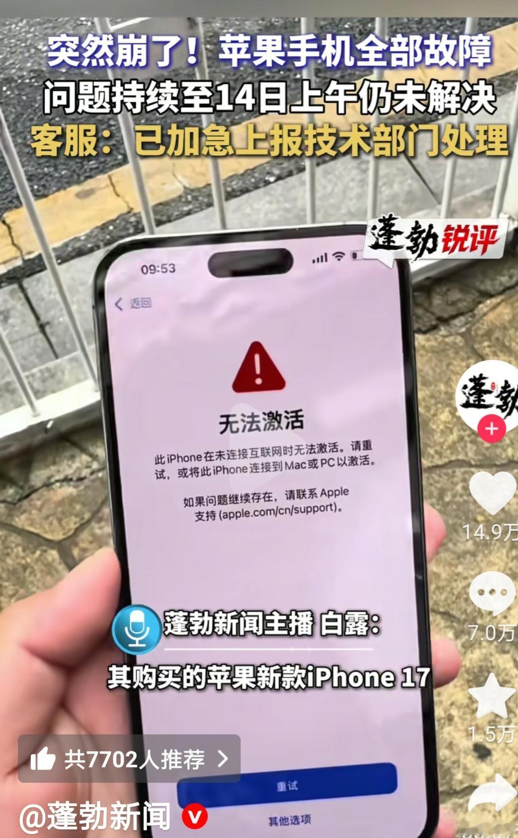 据报道,苹果新款手机iphone17突然“崩”了,无论试图用任种方式都联不上网络,虽然客服已上报技术部门处理,但是这种问题持续到14日上午仍未得到解决,最终也证实问题源于苹果服务端。 苹果新款手机这种严重现象在没有自然灾害或极端恶劣天气影响的情况下,还出现如果多故障非常罕见!如果不及时处理、恐怕可能将面临消费者维权侵诉问题,更大的影响是失去扩大用户的信任,真想不到一直属相对拥有领先技术的苹果公司,也如此不堪!