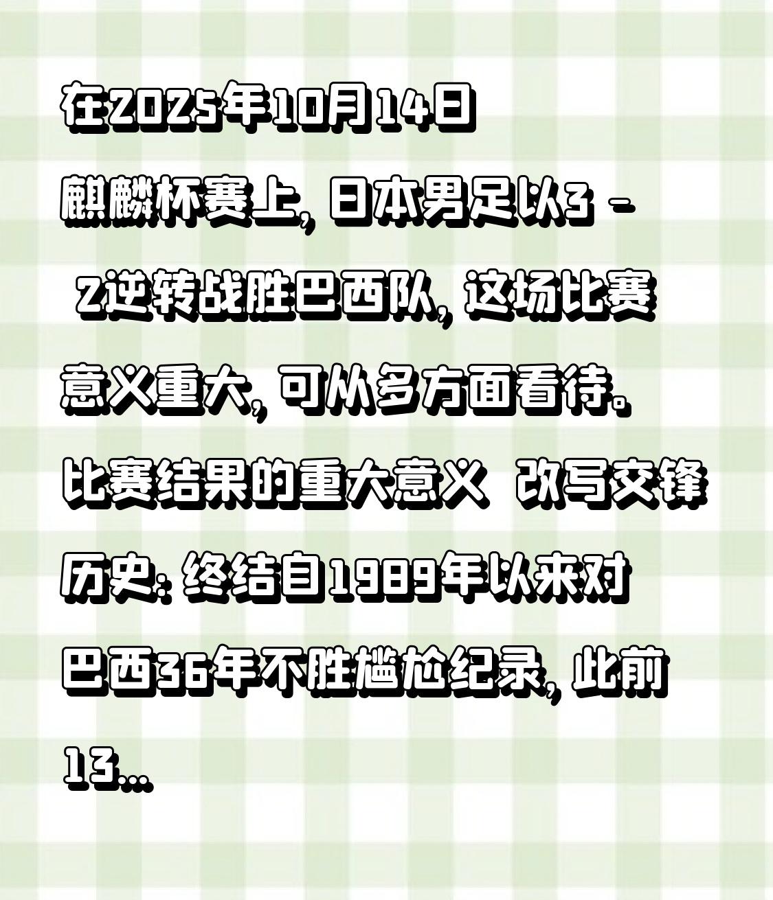 在2025年10月14日麒麟杯赛上,日本男足以3 - 2逆转战胜巴西队,这场比赛意义重大,可从多方面看待。 比赛结果的重大意义 ●改写交锋历史:终结自1989年以来对巴西36年不胜尴尬纪录,此前13次交手仅2平11负。这场胜利是日本足球从学习到抗衡巴西足球的质变标志。 ●亚洲足球崛起象征:成为21世纪首支击败巴西的亚洲足联球队,为亚洲足球崛起树立里程碑,证明亚洲球队有能力与世界顶级强队抗衡。 胜利原因分析 ●战术博弈出色:森保一战术调整灵活,上半场3421阵型低位防守,下半场换上伊东纯也变阵3412。日本队防守反击效率高,15次射门12次来自反击;下半场“全员压迫”逼得巴西失误;还利用巴西防空弱点,靠定位球制造威胁。 ●人才储备深厚:首发11人里9人效力欧洲五大联赛,“欧洲三叉戟”贡献全部进球。日本青训体系完善,J联赛与校园足球联动,人才源源不断。替补实力强,换上场的球员能改变战局,反观巴西有人才断层危机。 ●心理韧性强大:0 - 2落后时日本队严守战术纪律,不盲目进攻。关键球员心理素质好,伊东纯也、南野拓实表现出色。巴西队领先后松懈,降低比赛强度、换下核心球员,给了日本逆转机会。 ●足球哲学突破:日本结合欧洲传控理念与自身特点,形成独特风格。足协数据系统助力制定战术,还将东方哲学融入管理,塑造团队性格。 对日本足球的积极影响 ●增强信心:为备战2026年美加墨世界杯注入强大信心,证明有能力与世界顶级强队较量。 ●提升国际影响力:胜利引发全球关注,提升日本足球国际知名度和影响力,吸引更多资源投入。 给亚洲足球的启示 ●重视青训:构建完善青训体系,加强校园足球和职业联赛衔接,输送优秀人才。 ●勇于战术创新:不局限传统战术,根据对手和自身特点灵活调整,敢于尝试新阵型和打法。 ●培养心理品质:培养球员在逆境中的心理韧性和战术纪律性,面对强队保持信心和冷静。巴西队 巴西国家足球队 日本足球队 日本足球比赛 中日足球水平 巴西u23国足 巴西联队
