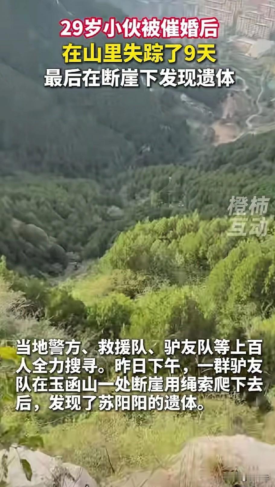 “可怜”失踪9天的29岁小伙苏阳阳找到了,警方、救援队、驴友三方出动,上百人搜救找了9天,没想到苏阳阳就在倒在离家2公里的地方。或许冥冥之中自有天意,老天也想指引他回家! 29岁211院校毕业,因为婚姻问题与家人发生矛盾,愤然剃头离家进山。看视频小伙子长相也可以,带着眼镜斯斯文文,而且还是名牌大学毕业,接受过高等教育,好可惜! 想起民政局的标语,结婚是为了幸福,离婚也是为了幸福,所以结不结婚都是为了幸福! 有网友说,现在的结婚压力太大了,除了彩礼、钱财,就是找一个情投意合的对象也非常难。 有很多人到了一定的年纪选择成家,对另一半需求不高,稀里糊涂的结婚。 而往往接受了一定教育的男孩和女孩,更注重精神世界的共鸣,所以对婚姻更加谨慎,选择更加慎重。 没想到高考那么难,都能考上211,最后却因为这没了,总觉得太可惜,他本可以拥有更好的人生!