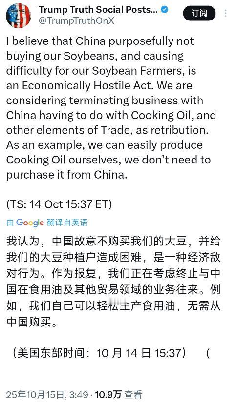 美国总统特朗普今天(北京时间10月15日)对中国喊话道:“我认为,中国故意不购买我们的大豆,并给我们的大豆种植户造成困难,是一种经济敌对行为。作为报复,我们正在考虑终止与中国在食用油及其他贸易领域的业务往来。例如,我们自己可以轻松生产食用油,无需从中国购买。” 当初是美国先单方面给中国输美农产品加高额关税,中国才按规矩采取反制措施,给美国大豆也加了税。这一加税,美国大豆的价格优势直接就没了。 之前美国大豆基础价本来比巴西还低40美元/吨,折合成人民币大概280元,可加上34%的关税后,总成本一下飙到509美元/吨。而巴西大豆的到岸价才420美元/吨,换算成人民币,美国大豆比南美大豆每吨贵出近千元。 中国作为大豆市场的“头号金主”,2023-2024年还买了2500万吨美国大豆,占美国出口的27%,比第二名欧盟多得多。但关税一加上,中国买家肯定不会花冤枉钱,从2025年5月起,对美国大豆采购就降到零了,这还是近30年来头一遭。 特朗普说中国让美国大豆种植户陷入困难,可事实是美国农民的困境,源头正是美国政府的关税政策。2019年美国政府给过230亿美元农业援助,可结果呢?美国直接丢掉了20%的大豆市场份额给巴西,之后再也没拿回来。 现在特朗普又承诺未来十年给600亿美元补贴,可这钱最早要2026年秋季才落实,对眼下急需帮助的美国农民来说,完全是远水救不了近火。 更讽刺的是,美国一边给自家农民画饼,一边还计划给阿根廷提供200亿美元金融支持。而阿根廷正是美国大豆出口的直接竞争对手,这操作让美国农民气不打一处来,直言“为什么要帮抢我们市场的对手纾困”。 再说特朗普嘴硬说“美国自己可以轻松生产食用油,无需从中国购买”,这话更是脱离实际。中国在食用油领域的供应链优势,不是美国说替代就能替代的。 中国不仅是食用油消费大国,在加工技术、产业链完整性上都有深厚积累。美国虽然能种大豆等油料作物,但食用油加工环节的效率、成本控制,跟中国比还有差距。 而且中国食用油出口到美国,早就形成了稳定的合作模式,美国很多食品企业、餐饮行业都依赖中国食用油的稳定供应和性价比。真要是终止合作,受影响的不光是中国企业,美国本土的食品价格可能会上涨,相关行业的成本也会增加,最后还是美国消费者和企业买单。 特朗普把中国正常的贸易反制说成“经济敌对行为”,完全是颠倒黑白。中国采购美国农产品,从来都是基于市场规律和自身需求,不是看谁的脸色。 2024年中国进口大豆总量有1.05亿吨,不是没需求,只是这些订单全流向了巴西和阿根廷。巴西大豆出口占中国市场的份额,从2018年的25%猛增到71.1%,2025年出口更是达到1.06亿吨,完全能满足中国需求。 中国早就和巴西在农业运输项目上布局,港口、铁路修得顺顺当当,供货稳定,质量还不比美国大豆差。阿根廷更直接,宣布大豆出口税归零后,短短两天就拿下70亿美元销售额,其中大半都是中国订单。 这些都是市场选择的结果,不是中国“故意”为之。特朗普要是真为美国大豆种植户着想,该做的不是喊话威胁,而是取消不合理的关税,让美国大豆重新具备价格优势。 现在美国大豆供应链涉及肥料、机械、仓储、运输等多个行业,支撑着美国4000多亿美元的经济。出口骤降导致货运需求断崖式下跌,相关就业岗位岌岌可危。 艾奥瓦州的拖拉机公司今年拍卖的农业机械数量都增加了30%,全美最大的农机制造商约翰迪尔公司,因为钢铁关税损失6亿美元,还裁员2500人。这些连锁反应,早就超出了农业本身,影响到了美国多个行业。 明尼苏达州四代农民达林・约翰逊急得直跺脚,他很清楚,就算现在达成协议,也赶不上今年的收获季了。而且供应链一旦固化,中国买家只会更倾向于“不找麻烦”的南美供应商——毕竟巴西大豆不仅便宜,还能用人民币结算,不用看美元波动和美国政策变脸的脸色。 美国大豆协会首席经济学家都承认,高昂的关税已经“事实上切断了美国农民与世界第二大经济体的联系”。这种情况下,想让中国恢复采购美国大豆,得先解决关税这个核心问题,而不是靠威胁终止其他领域贸易往来。 特朗普说要终止与中国在食用油及其他贸易领域的业务往来,看似强硬,实则是在拿美国自身利益冒险。中美贸易互补性很强,食用油贸易只是其中一部分,真要是搞“脱钩”,美国相关行业会面临供应链断裂、成本上升的问题,最后受损的还是美国本土经济和民众利益。 做生意讲究的是互利共赢,不是强买强卖,更不是用威胁手段逼迫对方。中国不买美国大豆,是因为有更划算、更稳定的选择;要是美国一直不明白这个道理,还在关税问题上死磕,只会看着自家的大豆在仓库里继续积压,让美国农民的日子更难过。