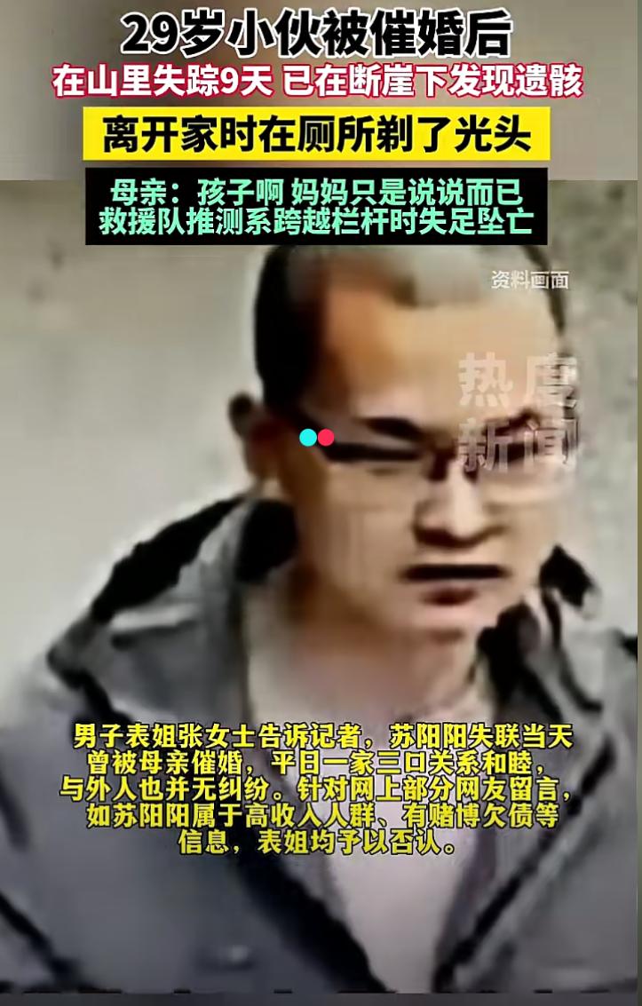 济南29岁男子被催婚离家出走山里失踪后续:9天后在一悬崖下找到尸体。 救援队猜测他是越过栏杆的时候不小心掉下去的。 这个男子学历高,是211毕业,身高也高,一米八几,妥妥的学霸高个大帅哥,可惜了。他的妈妈在现场哭得撕心裂肺:“孩子啊,你这是要了妈妈的命。” 他离家出走那天,父母说他头发长,还催婚,他没有反驳,自己就去洗手间自己理了头发,然后出门爬山,期间还参加了公司的视频会议,可是当天失踪了,再也没有下山。 但是很多网友就猜测他可能不是不小心,而是故意轻生了,大家能想象到,家里总是有意无意说他头发长,有意无意数落他,说他找不到对象! 如果大吵大闹,辩驳反抗质疑都是好的,因为真正的愤怒生气和悲伤到极致反应都是很平静的,如果你和别人吵完架,正常这个人应该是和你大声吵吵的,但是这个人反应平静,无任何表情波动,那就很可怕了。