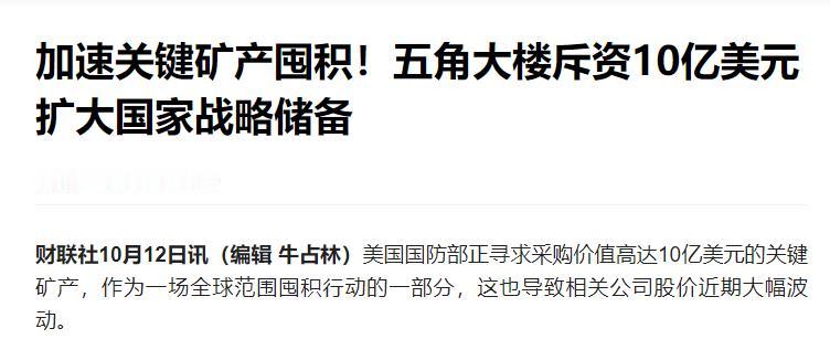 要赶在中国完全限制前囤货,五角大楼立马通过文件,要花10亿美元购买矿产,市场现有
