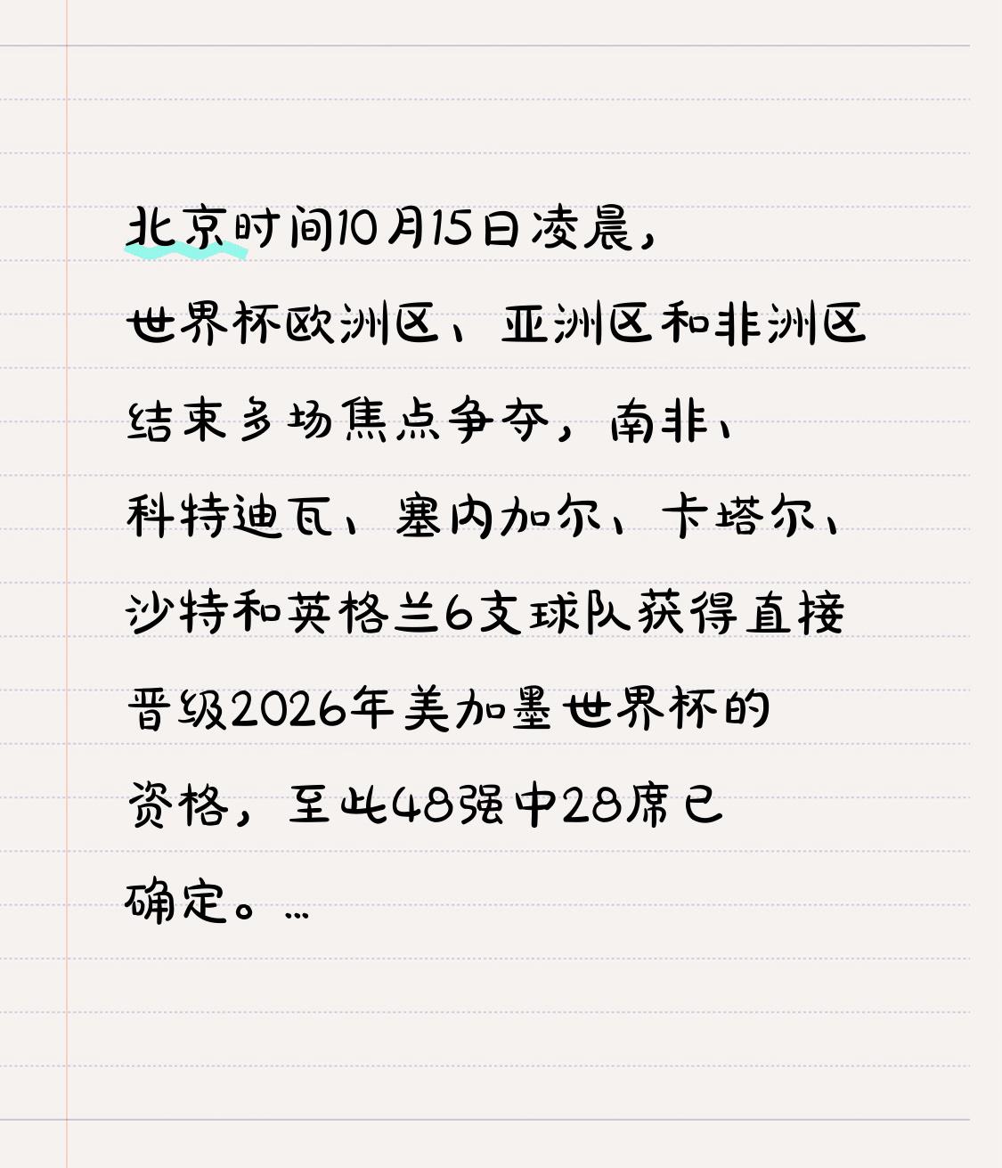 北京时间10月15日凌晨,世界杯欧洲区、亚洲区和非洲区结束多场焦点争夺,南非、科特迪瓦、塞内加尔、卡塔尔、沙特和英格兰6支球队获得直接晋级2026年美加墨世界杯的资格,至此48强中28席已确定。具体球队如下: ●中北美及加勒比:美国、墨西哥、加拿大; ●南美:阿根廷、巴西、厄瓜多尔、乌拉圭、巴拉圭、哥伦比亚; ●亚洲:日本、伊朗、乌兹别克斯坦、韩国、约旦、澳大利亚、卡塔尔、沙特; ●非洲:摩洛哥、突尼斯、埃及、阿尔及利亚、加纳、佛得角、南非、科特迪瓦、塞内加尔; ●大洋洲:新西兰; ●欧洲:英格兰。 目前亚洲、非洲和南美的直通名额已全部确定,欧洲区参赛资格仍在角逐中。