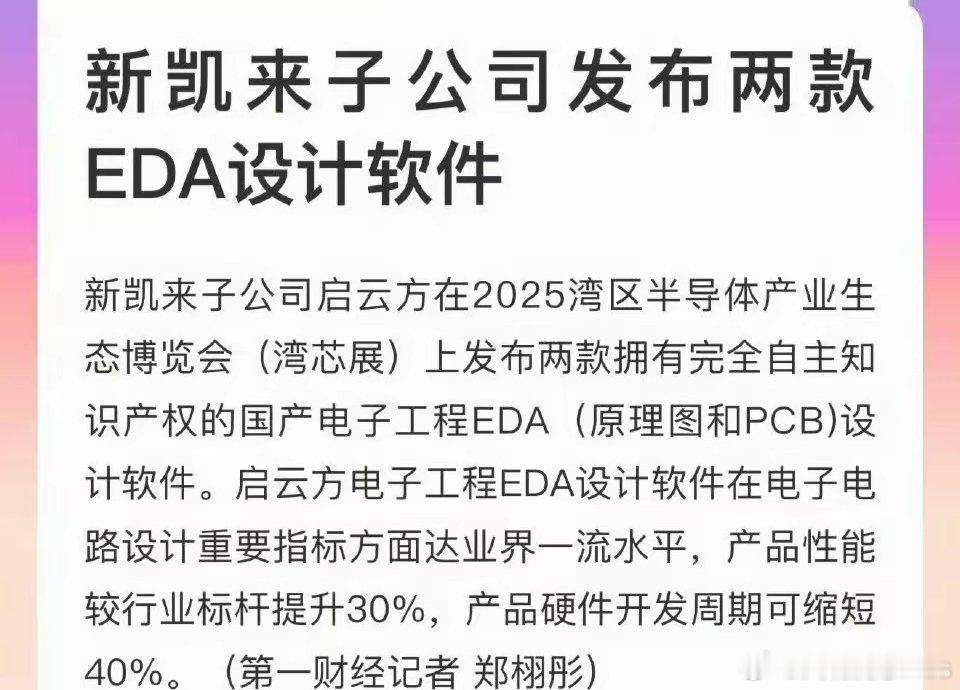 国产EDA软件终于站起来了!新凯来旗下子公司启云方,发布两款EDA设计软件,在电子电路设计重要指标方面达业界一流水平,产品性能较行业标杆提升30%,产品硬件开发周期可缩短40%!