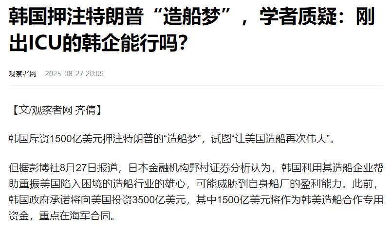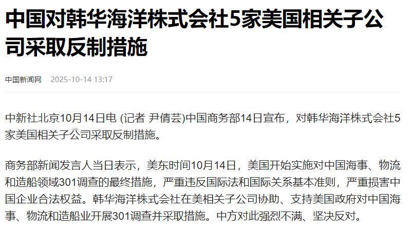 中美贸易战,韩企掏出215万亿“援美”,被中国商务部直接拉黑!   今年8月的时候,韩国高调宣布与美国合作启动“让美国造船业再次伟大”项目,计划向美国造船业投资1500亿美元,换算成韩元约215万亿,用来帮美方建船厂、培养专业人才。   韩国本想借着这笔巨额投资在中美之间分一杯羹,没成想才过两个月,就被中国商务部直接列入“黑名单”,落得个得不偿失的下场。   10月14日,中国商务部发布2025年第6号公告,明确对韩华海洋株式会社的5家美国子公司采取反制措施,简单说就是禁止中国的公司和个人跟这些公司做任何生意、搞任何合作。   按照商务部的官方说法,直接原因就是这些子公司帮着美国对中国造船业搞所谓的301调查。   301调查是美国搞贸易保护的常用手段,韩华海洋的美国子公司偏偏在这个时候凑上去帮忙,明显是站到了中国企业合法权益的对立面。   而中国造船业这些年在全球市场上的表现越来越亮眼,靠着不断搞技术创新和控制成本,拿下了不少订单。根据武汉航交所的数据,今年7月全球新船订单里,中国船企占了75%的份额,1到7月累计市场占有率也有56%,稳稳坐在全球第一的位置。   这样的发展势头自然让有些国家坐不住了,美国发起301调查,说白了就是想遏制中国造船业的发展。而韩华海洋一边给美国砸巨款搞造船合作,一边让子公司协助调查,这种两头操作损害中国利益的行为,显然不可能不受到反制。   我们向来讲究公平公正的贸易原则,不是随便就会对企业采取限制措施的。这次商务部的反制,是依据《中华人民共和国反外国制裁法》做出的合法回应,既保护了国内造船企业的利益,也向外界传递了一个明确信号:中国不会任由其他国家和企业破坏正常的贸易秩序。   其实美国搞的这套贸易保护手段,不光中国反对,连美国自己的产业界都有不少反对声音,因为这种做法会推高美国国内的通胀,还会影响美国港口的竞争力和就业,纯属损人不利己。   而在全球贸易这个大圈子里,合作共赢才是长久之道。像韩华海洋这样,想靠着依附单边主义、贸易保护主义来谋好处,最终只会搬起石头砸自己的脚。