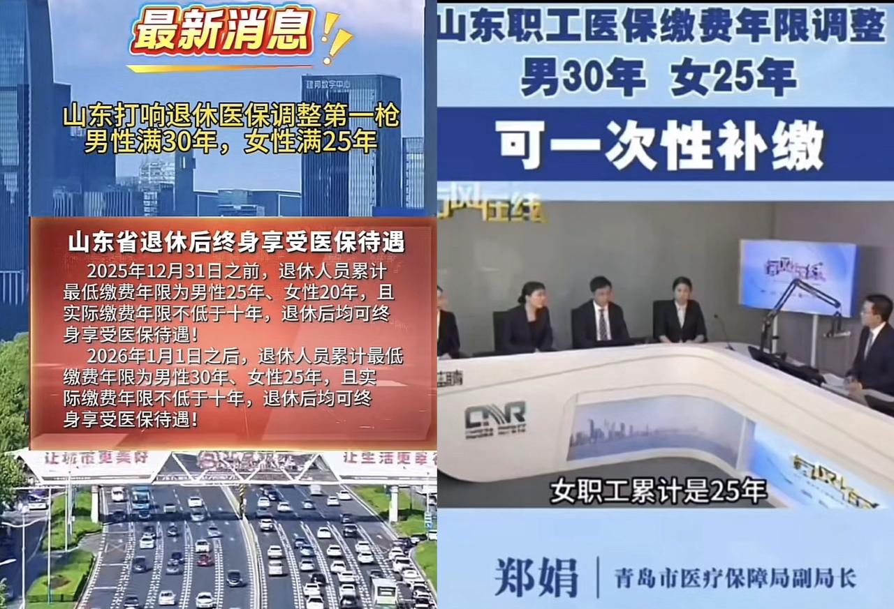 第一枪已经率先打响, 男性必须缴满30年, 女性必须缴满25年,才能享受医保待遇 山东这回真是放了记响炮。2026年1月1日起,全省职工医保门槛直接拉到男30年、女25年,比原先多了整整五年。消息砸下来,80后打工群当场炸锅——尤其是83年那批“裸缴”党,眼瞅着离退休只剩十几年,现在凭空多出一截缴费年限,算盘珠子崩一脸。 这可不是山东一家的事儿,多地都在响应国家号召,统一缴费年限。为啥这么做?说是促进公平,其实医保基金压力山大才是关键。退休人员医疗费用占比太高,基金池快顶不住了。 这对咱打工人影响可不小,年轻人还好,可那些中年转行、社保中断的,补缴费用是个沉重负担。普通家庭月薪掐掉房贷学费,再抠笔医保钱,月底真得蹲冰箱门口数鸡蛋。 但话说回来,拉长缴费也不是纯坑人。现在人均寿命蹭蹭涨,七八十岁常态,老年慢性病全指望着医保兜底。 换个角度,基金稳定了,以后看病报销也更有保障。但就怕其他省份跟着学,到时候全国打工人都得纠结:多交钱换老年医疗保障,还是赌自己身体好省下这笔钱?大家会怎么选?