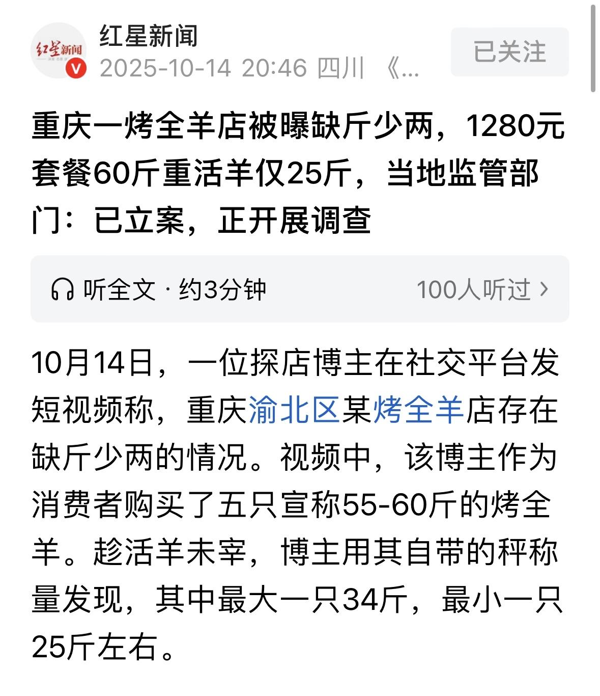 重庆,男子团购烤全羊套餐,55-60斤重的羊套餐价1280元,男子买了5只,到场后男子发现羊都很小,就拿出提前准备的称,趁活羊还没被宰之前称重,称后他发现,其中最大的一只才34斤,最小的只有25斤左右,这跟店家宣传的差太远了…对此,店家是这么解释的。 10月10号这天,一个探店博主在团购平台上的烤全羊店买了五只“55-60斤”的碳烤内蒙雪山羊,一份的团购价是1280。 为了验证重量,他特意携带自备电子秤,在活羊没有宰杀前进行现场称重,结果却令人瞠目。 只见最大的一只羊只有34斤,最小的只有25斤左右,五只羊的重量较宣传值缩水近半。 博主当场拨打市场监督管理局电话投诉。很快,两名身着制服的工作人员赶到现场,与博主、店家三方共同复称。 结果显示,四只羊重量分别为34.2斤、31.1斤、29.1斤、27.4斤,第五只羊因设备问题没有完成称重。 但现场工作人员直言,这数据和宣传的确实对不上号,具体差多少还要再核对。 视频发布后,有眼尖网友发现这家店的团购套餐已经悄悄改了,原本标价1280元、标注“55-60斤”的套餐,如今调整为1286元、标注“35-40斤”的新套餐,且在菜品名称中特别强调“足斤足称”。 记者以消费者身份致电这家店,负责人解释说,1280元那个套餐是之前的促销活动。现在天气转冷,羊肉成本上涨,我们不得不调整价格和重量标注。 现在的斤数都是实打实的,我们的秤去年刚通过市场监管部门质检,有效期到明年6月,不信你可以自己带秤来称。 对于博主反映的缺斤少两问题,店家另有说法,他们表示,当天仓库确实有符合55-60斤标准的羊,但因为物流延迟,那批羊还没运到,这位顾客就急着称了现有的羊。 当被追问具体细节时,对方以“正在配合调查”为由婉拒采访,表示一切以官方调查结果为准。 市场监督管理局龙山所工作人员向记者证实,已经立案调查中,目前正在比对商家宣传资料、交易记录、称重设备鉴定报告等证据,后续将公示调查结果。 现在天气冷了,烤全羊可以说是冬季聚餐的“硬菜”,动辄上千的价格却遭遇这么大的重量缩水,确实让人寒心。 这个视频我看了,博主去吃羊付了60斤的羊钱,看羊有点小就自己秤了一次,五只羊最重的35斤最轻的25斤,店主杀羊之前博主还问了一句是不是我的羊,店主确认是的,有人搜了一下这家店月销2000单,如果都是这么算的话,这家店一个月最少黑了顾客100多万… 想不用想,1280元有活羊60斤吗?我们当地吃草的黑山羊一只60斤左右的活羊要差不多2500元! 不过也有懂行的朋友说,这个真是倒霉了,懂的人都知道,一只羊大约50-60斤,杀完的肉就是30左右斤! 那么,从法律角度来看,烤全羊店缺斤少两的行为是否构成欺诈? 《消费者权益保护法》第55条规定:经营者提供商品或者服务有欺诈行为的,应当按照消费者的要求增加赔偿其受到的损失,增加赔偿的金额为消费者购买商品的价款或者接受服务的费用的三倍;增加赔偿的金额不足五百元的,为五百元。法律另有规定的,依照其规定。 烤全羊店在团购平台明确标注“碳烤正宗内蒙雪山羊(55-60斤)”,并以1280元价格销售,但消费者现场称重发现五只羊实际每只重量仅为25-34斤,明显远低于宣传的标准。 这个行为已经涉嫌构成欺诈, 商家既然在商品页面明示“55-60斤”的重量参数,那就属于对商品关键信息的承诺性宣传。 消费者基于这个信息购买,但是实际交付的商品重量存在显著差异,构成“虚假或引人误解的宣传”。 商家辩称“因物流延迟导致符合标准的羊未到”,但没能提供物流记录或库存凭证佐证。结合其事后调整套餐标注为“35-40斤”并强调“足斤足称”的行为,可以合理推定商家对重量不符事实知情,存在主观故意。 所以,消费者有权要求商家“退一赔三”。即退还团购费用,并额外赔偿三倍价款。 如果商家拒绝,消费者可向市场监管部门投诉或提起民事诉讼。 商家称“秤已通过质检且有效期至明年6月”,但这个抗辩仅能证明计量器具合法,不免除他因为虚假宣传产生的民事责任。 称重设备合法仅仅是交易基础,商品实际重量与宣传不符仍构成欺诈。 截至10月15号,这家烤全羊店仍在正常营业,但涉事套餐已暂时下架。 对此,你怎么看? 关注@运良说法 学法律知识不迷路