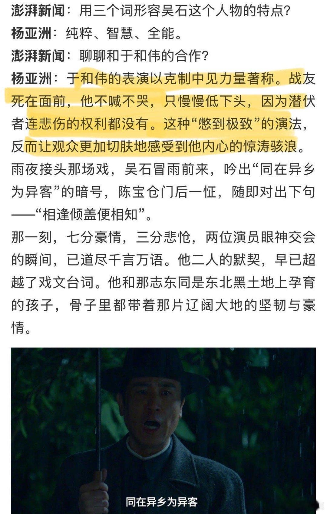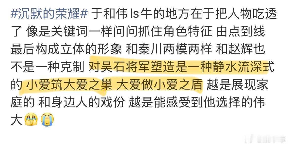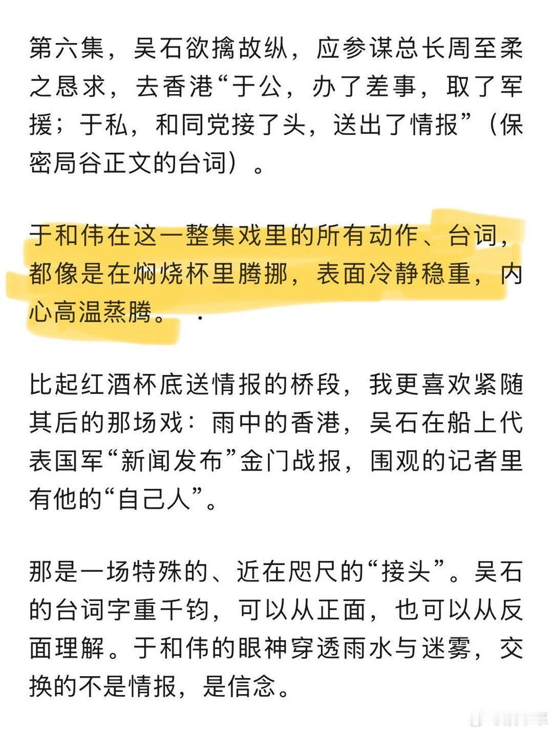 于和伟的表演以克制见力量 于和伟在《沉默的荣耀》中绝了!他将吴石的“克制”演绎到极致,游走对手阵营,内心翻涌却面若平湖。深思熟虑的演法,让角色情感在观众心中激荡,实力封神!