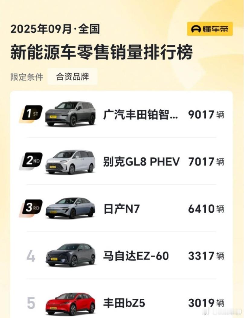 全球化布局的底气,来自内地市场的硬核战绩。据懂车帝销量排行榜显示,铂智 3X 以 1.2 万辆销量斩获 9 月合资新能源车销冠。