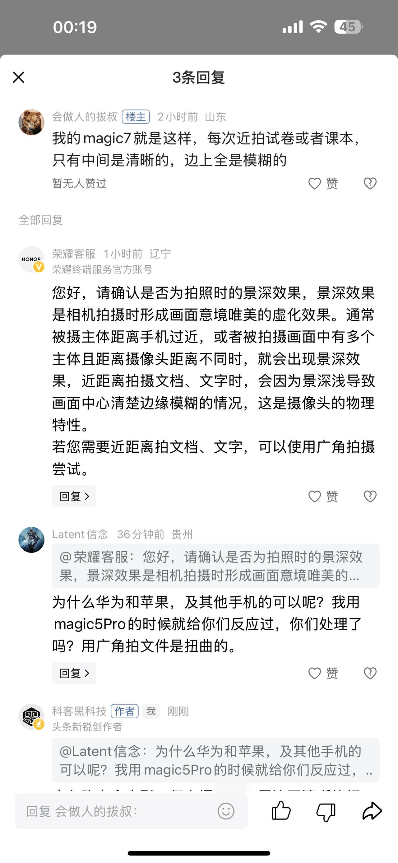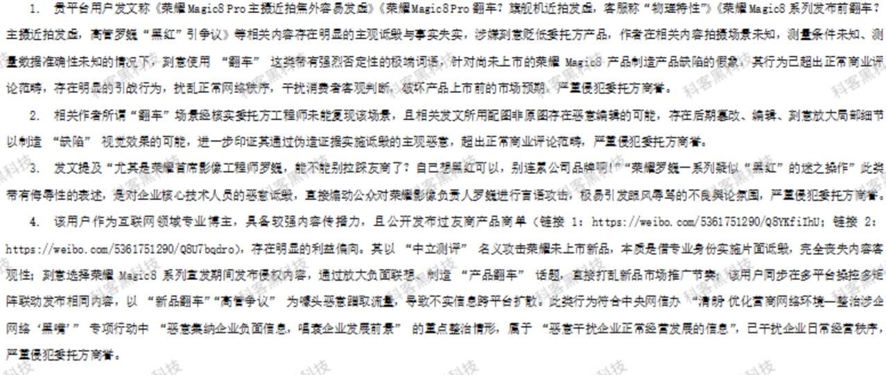 来来来,看看荣耀团队做的“好事”!近期我们反馈的荣耀Magic8 Pro近拍发虚问题,荣耀不是积极解决问题,而是在各平台疯狂恶意投诉,无所不用其极,欺人太甚! 比如说,荣耀竟称“工程师未能复现该场景”,这属于片面之词,更没有拿出实证。我方已经用超过三台荣耀手机拍出了问题,有图有真相,具备充足说服力。如果真如荣耀所说,荣耀工程师的真实水平真要打个大问号了! 荣耀甚至无理由揣测我方“恶意编辑”、“后期篡改”照片,实际情况并非如此,原图就是极好的说明。荣耀妄图通过对我方进行诽谤,掩盖自身产品问题。 荣耀造谣我方“黑嘴”,更是无稽之谈,如实反馈问题如果也是黑嘴,那所有用户都是黑嘴了?值得注意的是,我方的内容发布之后,收到许多荣耀机主的反馈,很多人称荣耀Magic系列的确存在类似问题。部分用户也通过各种平台向荣耀反馈过荣耀手机拍摄的问题与不足,希望得到改善,可惜要不就是石沉大海,要不就是被删帖,多年来问题依旧。如此傲慢对待用户的建议,实在令人心寒。 荣耀称我方发布过友商商品商单,存在明显利益偏向。然而提及的内容并非商单,荣耀没有拿出有力证据就恶意揣测,转移视线,完全站不住脚跟。事实上我们也发过许多荣耀的内容,难道都是商单? 至于我们说提及的荣耀首席影像工程师罗巍,其言行存在的争议网络随处可查,确实也造成了对荣耀品牌的不利影响,荣耀竟说我们“恶意诋毁”、“言语攻击”罗巍,难道说事实有错了吗。那请问罗巍作为荣耀员工,骂用户和网友的时候呢?荣耀是默许他这种行为?有博主给荣耀CEO李健写信,希望对罗巍的言行进行处理,只可惜至今无回应。 回到问题的开始,结合连日来在各平台与用户、博主的沟通,其实荣耀Magic8 Pro主摄近拍不能把画面全部拍清晰的问题,主要是其“大底大光圈”近拍时容易产生景深效果所致,但绝非无解。行业内有同行通过物理可变光圈的方案,对类似问题能够较好解决。也有同行通过精度跃迁技术,显著提升照片从中心到边缘的清晰度。事实上,如今手机影像技术的进步很快,结合AI相关应用,许多传统场景下拍摄的难点已经可以得到优化和提升,讲真荣耀影像团队如果真能改善问题,偷师也不丢人啊。 站在用户的角度,用户近距离把文档、画面全部拍清晰,属于基础的需求,旗舰机如果连用户基础需求都做不好,是不是要好好反思了?用户要的不是所谓“科普”,而是有效解决问题。好高骛远,脱离实际需求,不顾用户感受和反馈,只会让用户离你越来越远。 忠言逆耳利于行,荣耀,希望你们能够好好思考到底是谁给你们的荣耀。