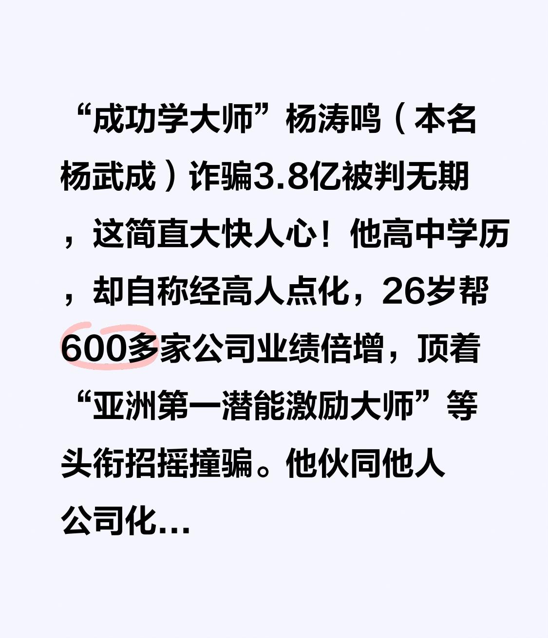 “成功学大师”杨涛鸣(本名杨武成)诈骗3.8亿被判无期,这简直大快人心!他高中学历,却自称经高人点化,26岁帮600多家公司业绩倍增,顶着“亚洲第一潜能激励大师”等头衔招摇撞骗。 他伙同他人公司化运作,用虚立人设、制造假象、编造案例等手段,让学员陷入“交越多钱越能快速成功”的陷阱。很多人刷信用卡、借款缴费,结果课程内容重复,毫无实际作用,还债务缠身。7年涉案3.8亿,他曾宣称“一根头发卖6万”,如此疯狂敛财,判无期真是罪有应得!其妻子刑罚虽有改判,但也受到了法律制裁。大家可千万别再被这类“大师”忽悠了。