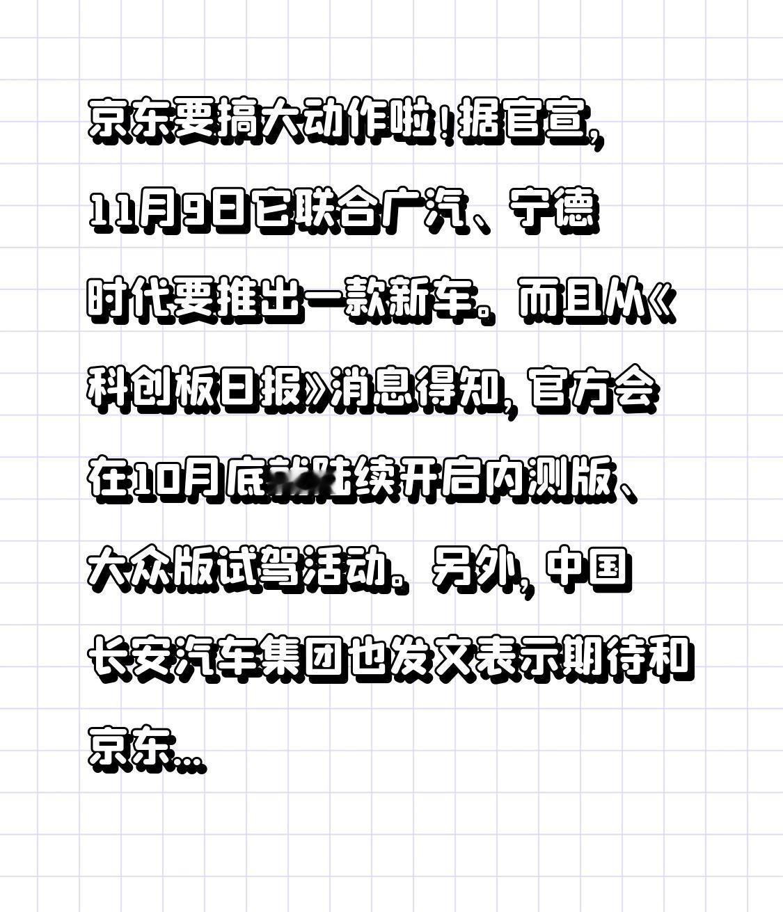京东要搞大动作啦!据官宣,11月9日它联合广汽、宁德时代要推出一款新车。而且从《