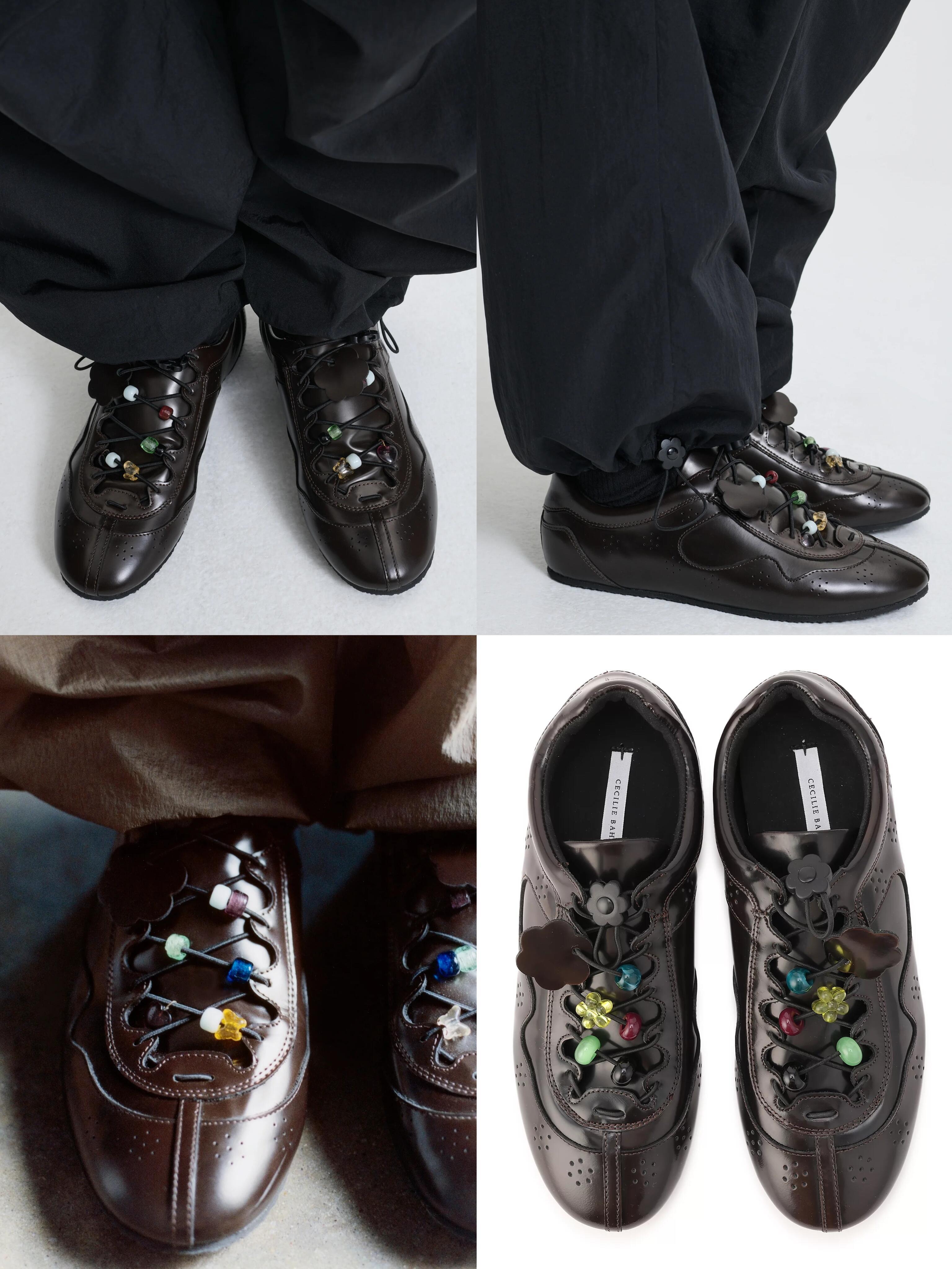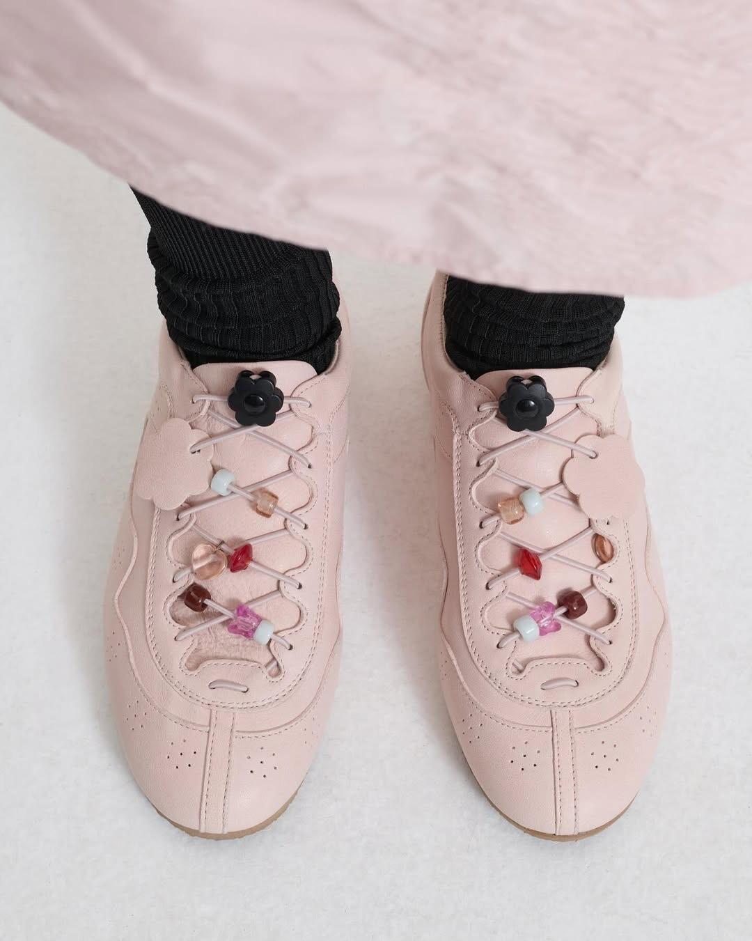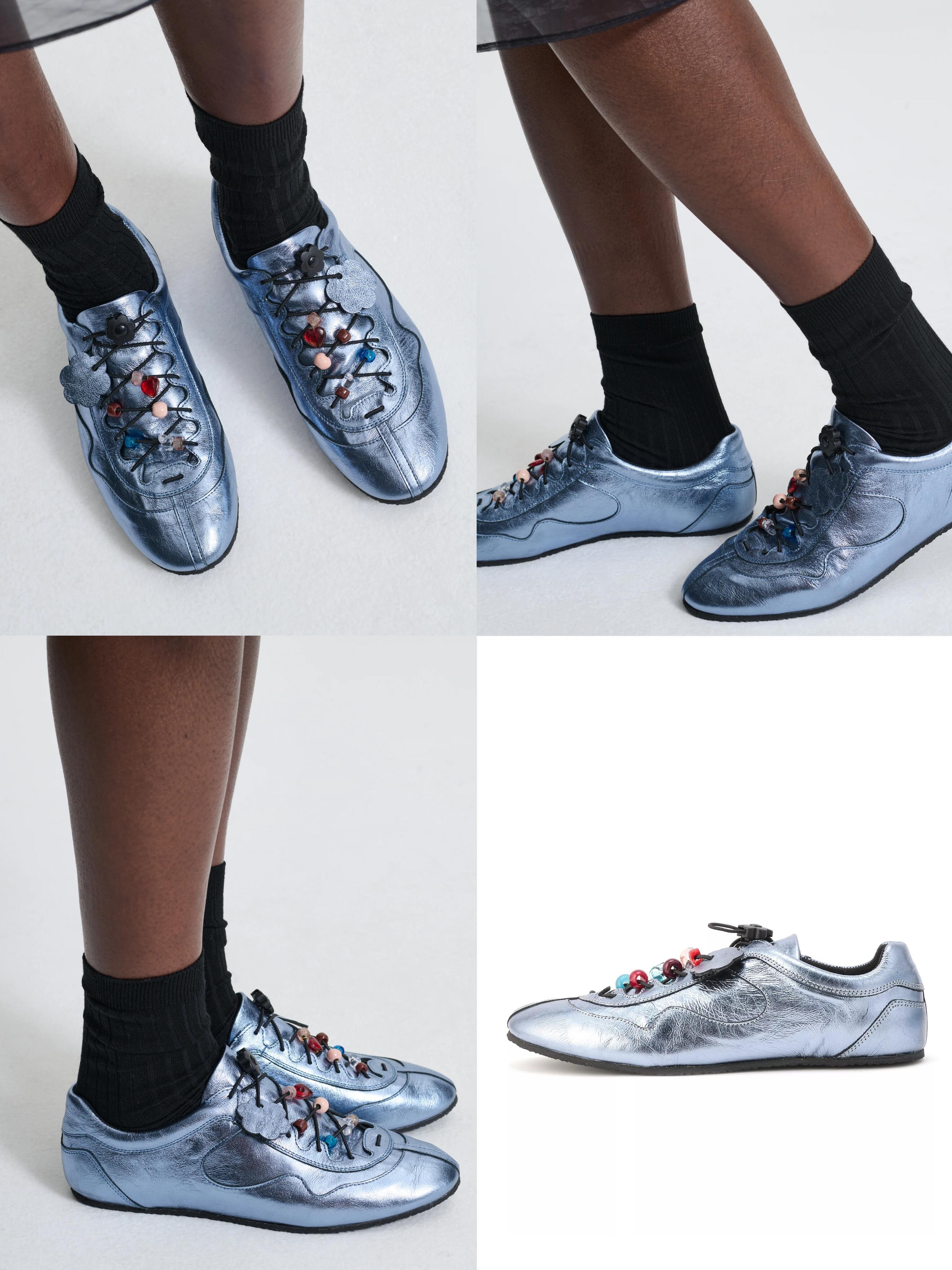 当褶皱皮革泛起金属光泽,当纤细鞋身缀上足背珠饰——Cecilie Bahnsen新推出的2025早秋Blaise运动鞋,把「复古优雅」和「当代趣味」揉成了造型里的惊喜。