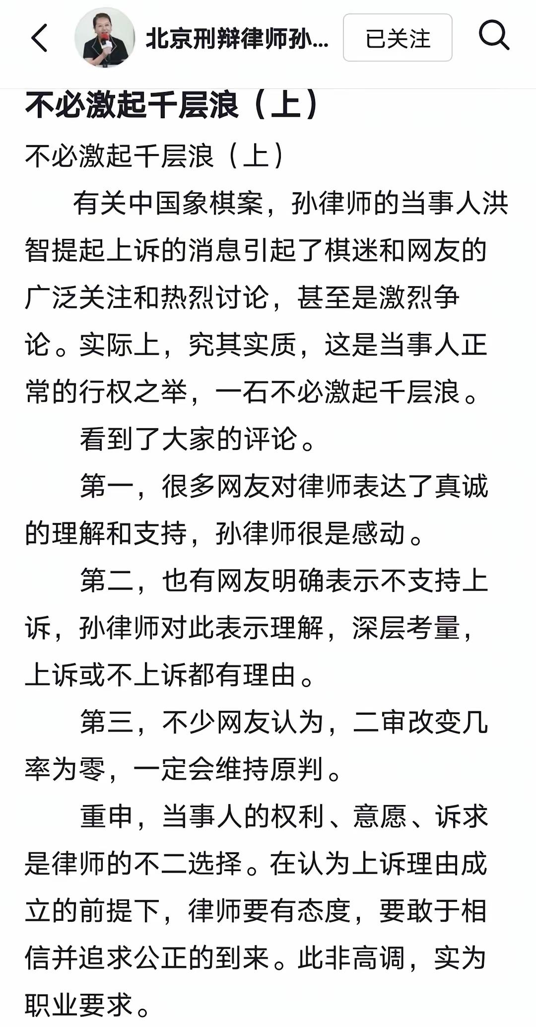 中国象棋第一审结束后,洪智上诉。 当事人对一审判决提起上诉,是法律明确规定的权利,而且法律还规定,上诉不加刑(只是被告上诉)。 洪智的律师孙晓洋发文:不必激起千层浪。是的,正如孙律师所言,洪智上诉只是正常的行权之举,不应该有那么多的非议。 无论二审结果如何,就应该这样——依法上诉。 支持洪智上诉。象棋第一人认罪 棋协终身禁赛 象棋比赛争议