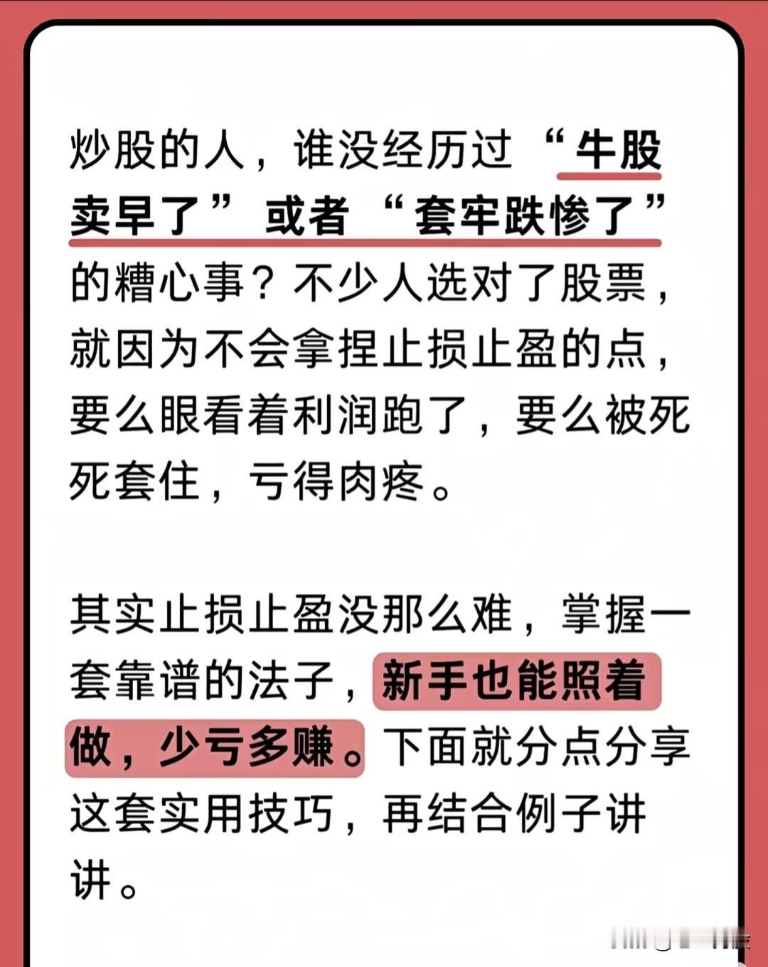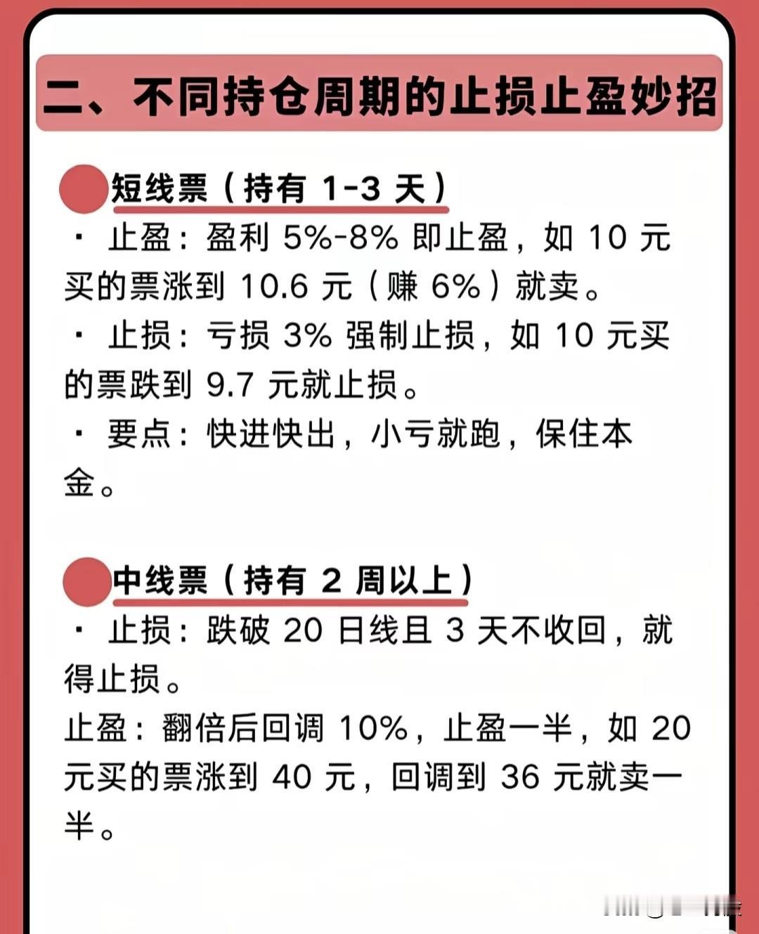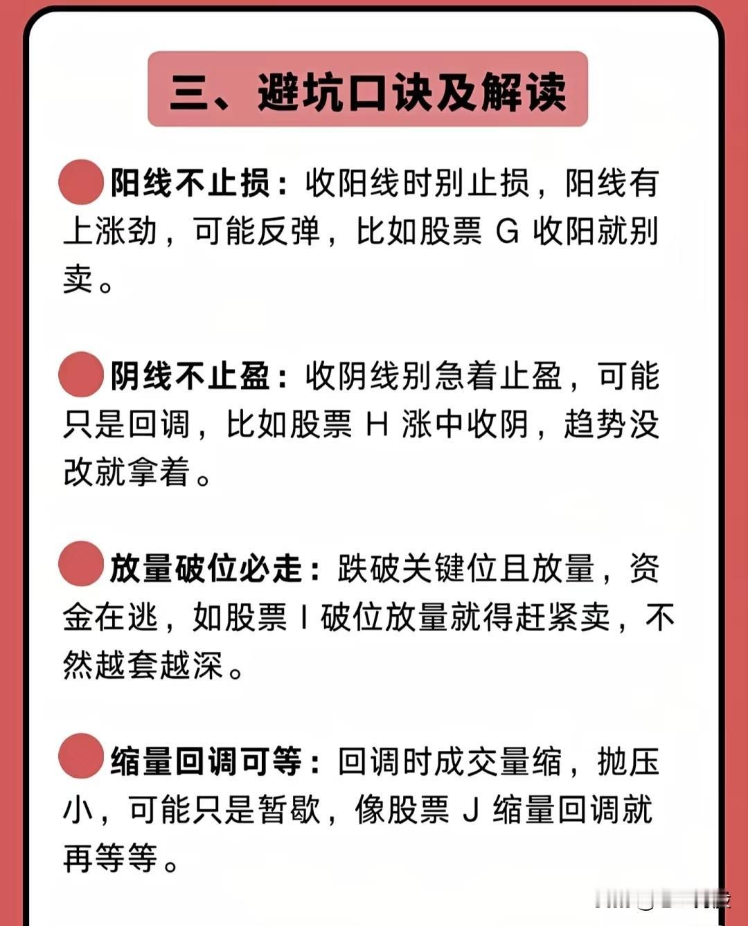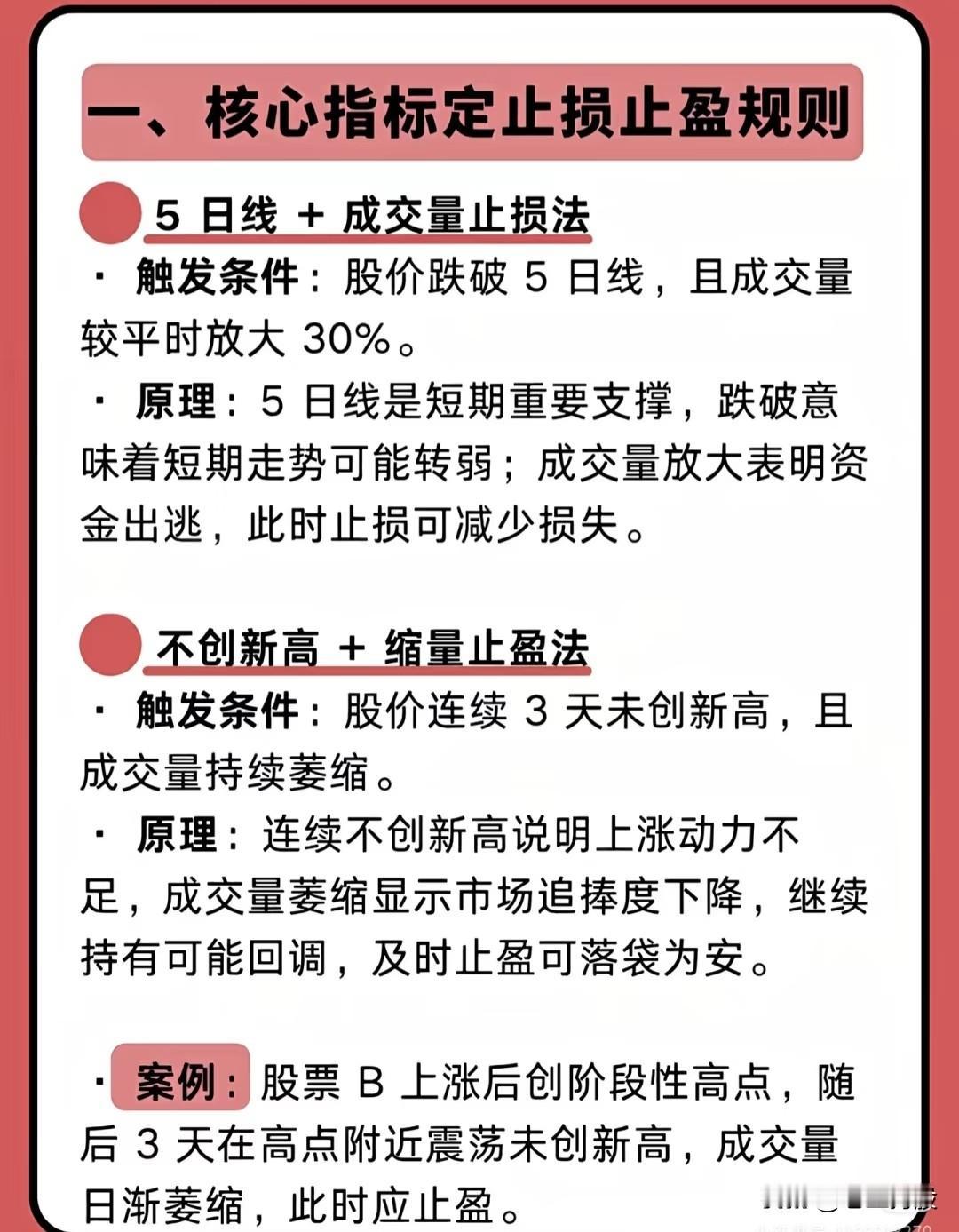【股票投资止盈止损策略教学】收藏研究,主要包含以下核心要点: 一、策略价值主张 - 核心宣传点:通过"止盈止损公式"(宣称胜率85%),解决投资者"卖早卖晚"的纠结问题,避免牛股过早卖出或深度套牢。(第1张图) - 目标人群:新手及普通投资者,强调"掌握靠谱方法就能少亏多赚"。(第2张图) 二、核心方法论 1. 技术指标规则 - 止损: - 5日线+放量法:股价跌破5日线且成交量放大30%时止损(短期支撑破位+资金出逃信号)。 - 止盈: - 不创新高+缩量法:股价连续3天未创新高且成交量持续萎缩时止盈(上涨动力衰竭信号)。 - 案例:股票B高位震荡未创新高且缩量时需止盈。(第3张图) 2. 持仓周期策略 - 短线(1-3天): - 止盈:盈利5%即卖出(如10元→10.6元)。 - 止损:亏损3%强制止损(如10元→9.7元)。 - 原则:快进快出,小亏保本。 - 中线(2周以上): - 止损:跌破20日线且3天不收回。 - 止盈:翻倍后回调10%卖一半(如20元→40元→回调至36元)。 - 要点:长线需容忍波动,但关键位置严格操作。(第4张图) 3. 避坑口诀 - 阳线不止损:收阳线时保留(可能反弹)。 - 阴线不止盈:上涨中途的阴线可能是回调。 - 放量破位必走:关键位放量下跌时立即止损(如股票I)。 - 缩量回调可等:缩量调整可能是短暂休整(如股票J)。 - 解读:通过量价关系判断真假信号,避免情绪化操作。(第5张图) 三、策略逻辑总结 1. 技术面驱动:依赖均线(5日/20日)、成交量、股价形态(创新高/回调)等量化信号。 2. 仓位管理:区分短线/中线周期,匹配不同风险承受能力的操作频率和目标。 3. 行为心理:通过口诀规避常见错误(如因短期波动过早止损/止盈)。 四、用户收益 - 解决痛点:明确买卖时机标准,减少主观犹豫。 - 风险控制:通过止损保护本金,止盈锁定利润。 - 适用性:覆盖短线快进快出和中线趋势持有两种主流策略。 (注:实际应用中需结合市场环境和个人风险偏好调整参数。)