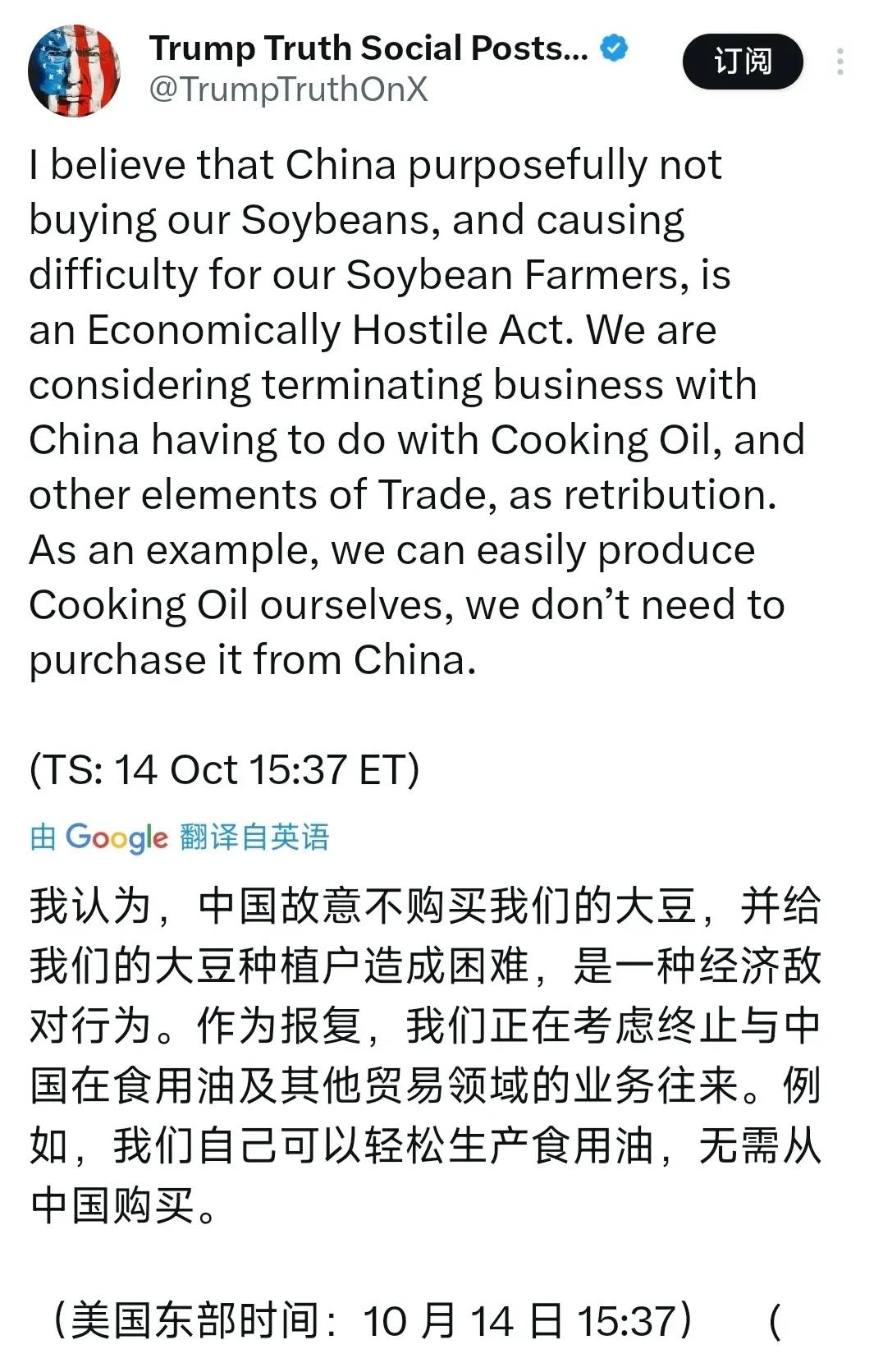 美国总统特朗普(10月15日)喊话:“我认为,中国故意不购买我们的大豆,并给我们的大豆种植户造成困难,是一种经济敌对行为。作为报复,我们正在考虑终止与中国在食用油及其他贸易领域的业务往来。例如,我们自己可以轻松生产食用油,无需从中国购买。”这就是美国打压中国经济发展的结果!特朗普应自我反省其贸易政策是否靠谱?你们应该自己炸大豆油,不要卖大豆了。这样不是更好,补贴农民办加工厂,反正美国的饮食大豆油完全可以啊。就是成本你们要好好计算好喔。美国可以自己榨油,可以做豆腐豆皮喝豆浆,美国人也要开始喝豆汁吃臭豆腐了。