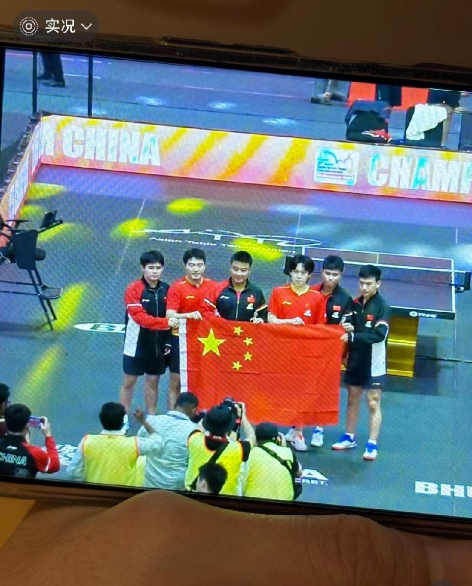 亚锦赛男团夺冠!国乒健儿扬国旗展雄风 在亚锦赛赛场上,中国乒乓男团强势登顶!王皓教练带领王楚钦等队员,身披荣耀,手持国旗,这一刻是属于中国乒乓的辉煌时刻,是拼搏与实力的最好证明,为你们骄傲,国乒男神们! 国乒荣耀