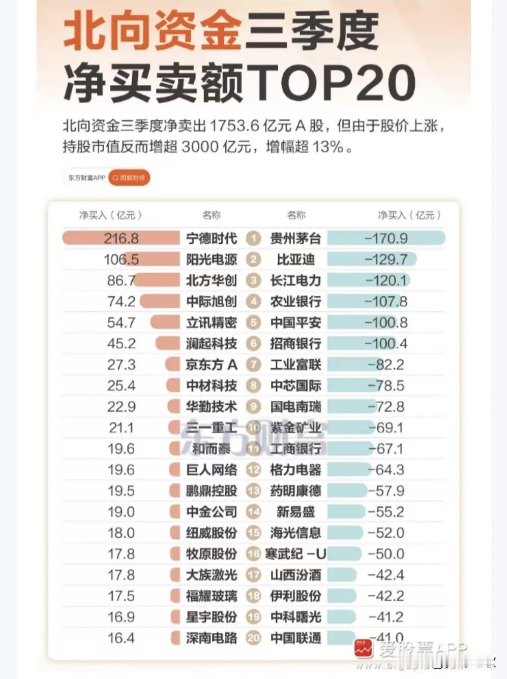 看看北向资金三季度卖出的情况,就知道为什么最近大权重都涨不起来了,同时科技股也卖 最新数据,北向资金卖出前三是贵州茅台,比亚迪,长江电力,都是以前的大牛股,但往下看就会发现以银行居多,这也是银行一直在跌的原因,同时,科技股也在遭到北向资金的抛售。 而北向资金一直在加仓的都是以“反内卷”的板块为主,前三名为宁德时代,阳光电源和北方华创,这也是宁王在盘中能够市值能够超过茅台的原因。 北向资金的仓位还是影响了A股的个股,但从三季度看卖出1753亿元,A股还是要谨慎对待。