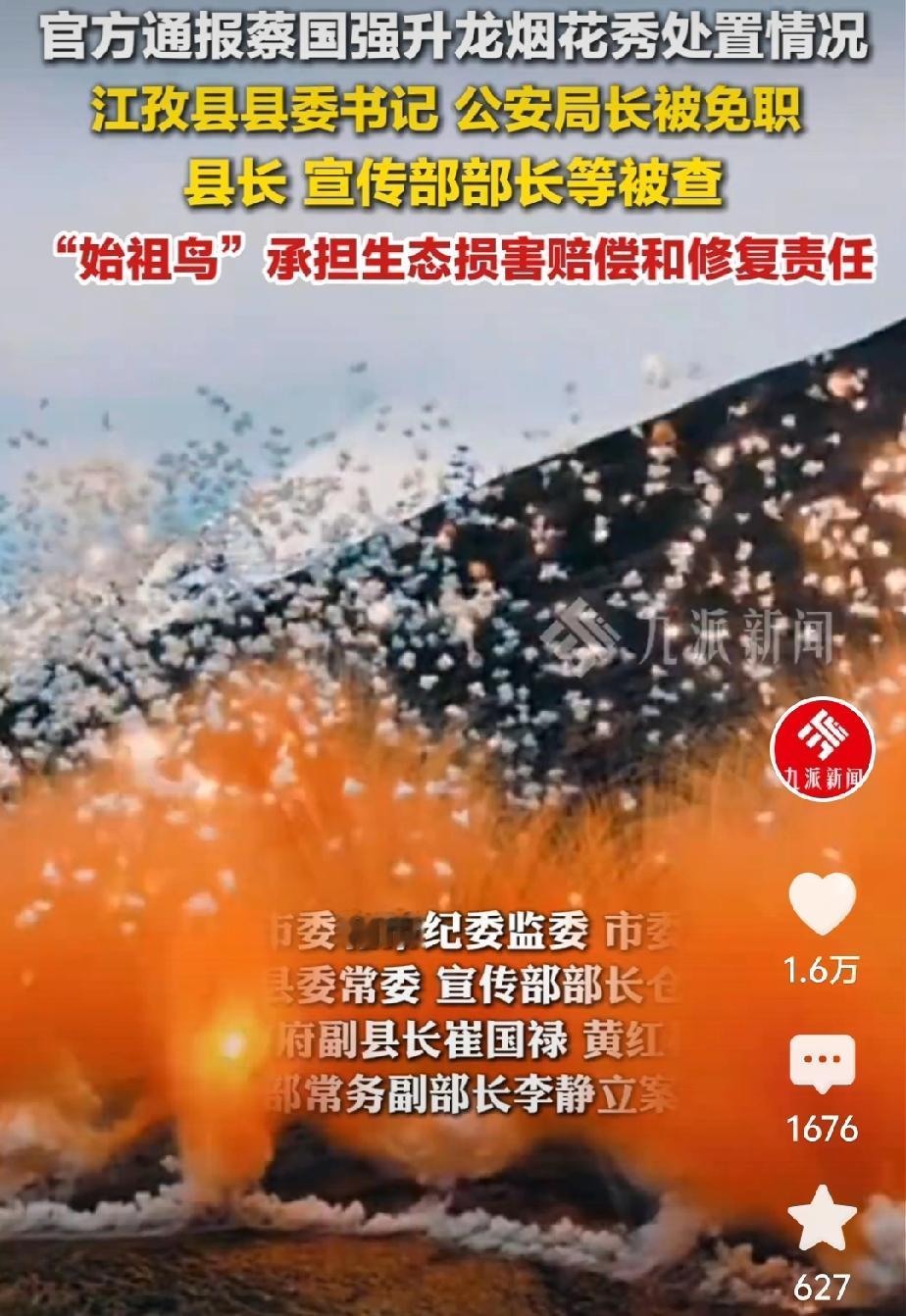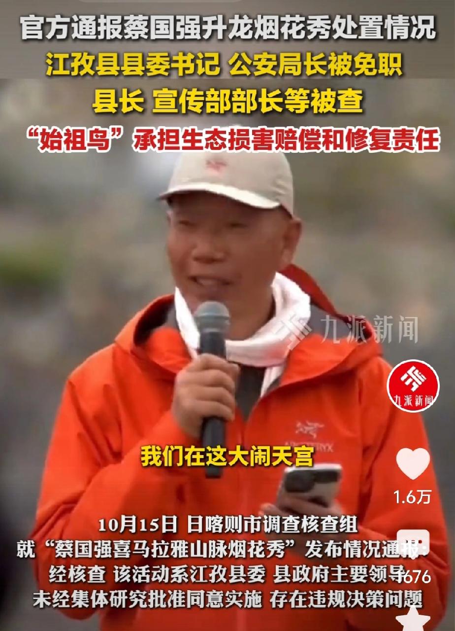 怎么也没想到,结果来的这么快!一场烟花秀,炸翻了官场的不作为。 都说了,北京蔡国强炸喜马拉雅山,没有当地人的支持,他是根本办不到的,因为他们这么大的阵仗,用蔡国强的话说,那是在大闹天宫。可惜他不是孙悟空。 国家对烟花秀的相关地区、相关人员还免职免职,该立案调查的立案调查,处理的还算及时,严肃,有理有据有力度,值得人民相信。只是不知还会深挖,看看背后有没有国外势力在捣鬼。在我们祖国的大地上,我们的祖先用生命捍卫的主权,决不能容枭小捣乱。 图片来自网络,侵删致歉!