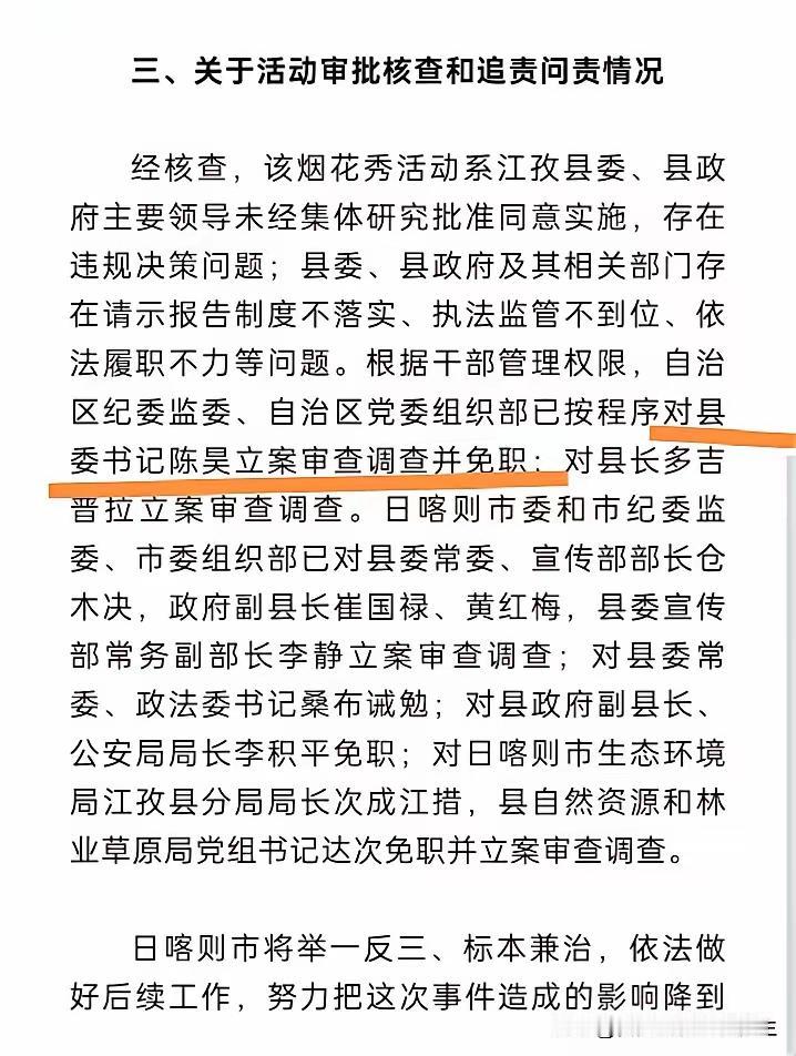 放了一场烟花,县官丢了乌纱!事实证明,蔡国强用烟花“轰炸”喜马拉雅山脉之后的那些天,我和广大网友担心责任人和责任单位得不到追究的担忧纯属多余。据央视新闻今日最新报道,艺术家蔡国强“烟花炸山”属地江孜县,县委县政府多位领导被免职或立案审查。蔡国强工作室和“始祖鸟”公司及有关责任人,也正在被查处之中…… 以前总有人觉得,艺术可以天马行空,破坏点环境没啥大不了。但这次处理明明白白告诉大家:生态保护是底线,不管你是搞艺术的还是当官的,碰了红线就得担责。 说白了,再美的烟花,也不能以伤害自然为代价。你觉得这事儿能给其他搞大型活动的人提个醒不?以后搞创作,是不是得先掂量掂量生态账?