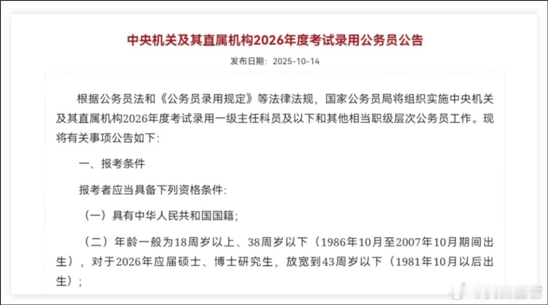 说报考者年龄上限从35岁提至38岁,2026年应届硕士、博士研究生更是放宽到43岁。