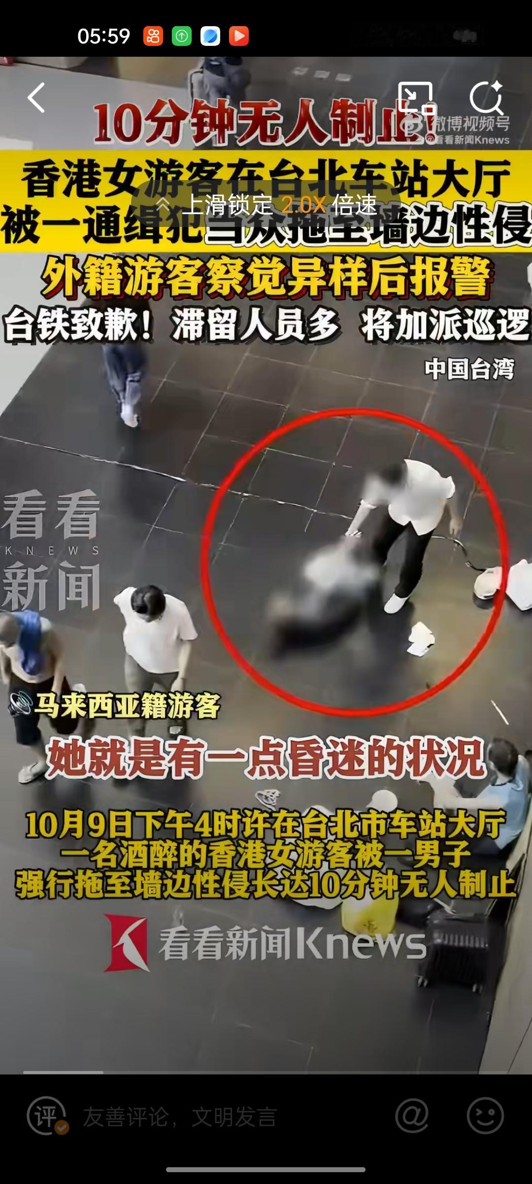 10分钟的沉默!台北车站的“集体冷漠”,比侵犯更刺骨 10月9日,一被通缉的邱姓男子在台北车站大厅将一名女子拖至墙边侵犯,长达10分钟无人制止,直到一名外籍旅客察觉异样才报警,引发哗然。 针对如此夸张的事情,外籍旅客表示,当时整个过程没有别人察觉,感到意外。他拍下画面留证,请同行朋友电话报警,随后前往大厅一楼的警察局报案。 很难想象,这荒诞的一幕发生在日均进出40万人次的台北车站——这个台铁旅运量第一的交通枢纽,本该是人流如织、烟火气十足的地方。10分钟里,不知有多少人擦肩而过:或许是赶车的旅客,或许是驻足的路人,或许是车站的工作人员,但没有一个人停下脚步,哪怕只是喝止一声或拨通报警电话。 最讽刺的是,最终打破沉默的,是一位异乡的外籍旅客。他那句“感到意外”,像一记耳光扇在所有人脸上。不是没有“察觉”,而是太多人选择了“无视”;不是事不关己,而是“责任分散”的心理在作祟——这正是心理学上的“旁观者效应”:人越多,个体的责任感越弱,仿佛救助的义务会平摊到每个人身上,最后反而没人出手。就像1964年纽约公园命案中,38位目击者的沉默,本质都是这种冷漠的自我开脱。 更让人不安的是,这并非个例。此前台北地铁曾发生官员当众猥亵女子事件,即便在高峰期车厢内,也是受害者自行按铃报警才制止恶行]。而这次,受害的香港女游客醉酒失去意识,更成了施暴者肆无忌惮的底气,也成了旁观者“多一事不如少一事”的借口。台铁事后加设围栏、提醒禁酒的补救,更像对自身失职的粉饰——真正该筑牢的,从来不是物理围栏,而是人心的防线。 我们总说“出门在外靠朋友”,可当危险降临时,最该依靠的“陌生人善意”却集体缺席。那位外籍旅客的举动,不过是做了最基本的正义之事,却反衬出一群人的麻木。他拍下的不仅是犯罪证据,更是一面照见人性的镜子:当冷漠成为常态,热闹的车站也会变成无人守护的“荒原”。 60年前Kitty Genovese案引发的反思言犹在耳,60年后类似的沉默仍在重演。这起案件炸出的,是“旁观者效应”下的人性软肋,更是公共空间里的安全漏洞。 如果你在场,会选择挺身而出吗?你觉得该如何打破这种“集体沉默”?评论区聊聊你的答案。车站事件 台北火车站