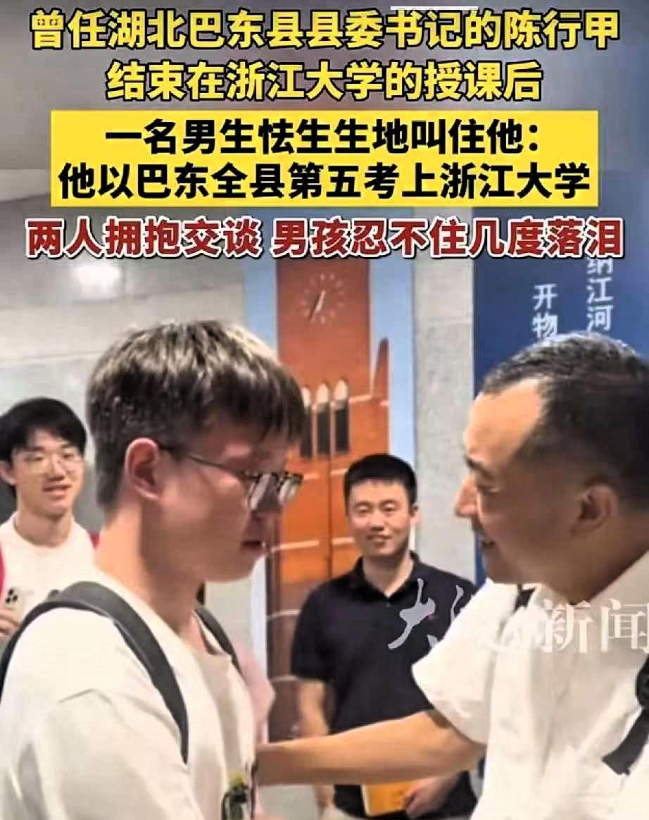 近日在浙江大学校园里,一场普通的相见,却让全网破防。陈行甲演讲刚结束,人群中一个叫向东升的巴东男孩,怯生生挤到他面前。两人一拥抱,男孩的眼泪就忍不住掉了下来 外人或许不解:不过是见个人,至于这么激动吗?可懂巴东的人都知道,这眼泪里装着多少不容易。以前的巴东山区,路难走、书难读,教育资源匮乏,多少孩子想读书却要翻山越岭。能从大山里拼出来,考上浙大这样的顶尖学府,背后是无数个挑灯夜读的夜晚,是比别人多十倍百倍的努力。 更巧的是男孩的名字——向东升,像极了每一个巴东娃子,憋着一股劲,朝着光亮拼命奔跑。而陈行甲的反应更暖,没有半点架子,轻轻拍着男孩的背,还随口说出巴东"谭田邓向"四大姓,最后主动承诺:"以后有困难就找我。" 这一抱,是跨越山海的理解;这一句话,是给追梦人的底气。真正的温暖,从来不是轰轰烈烈,而是有人懂你来路的艰辛,也愿为你照亮前路。 你有没有遇到过这样的人,一句话、一个拥抱,就让你觉得所有努力都值得?