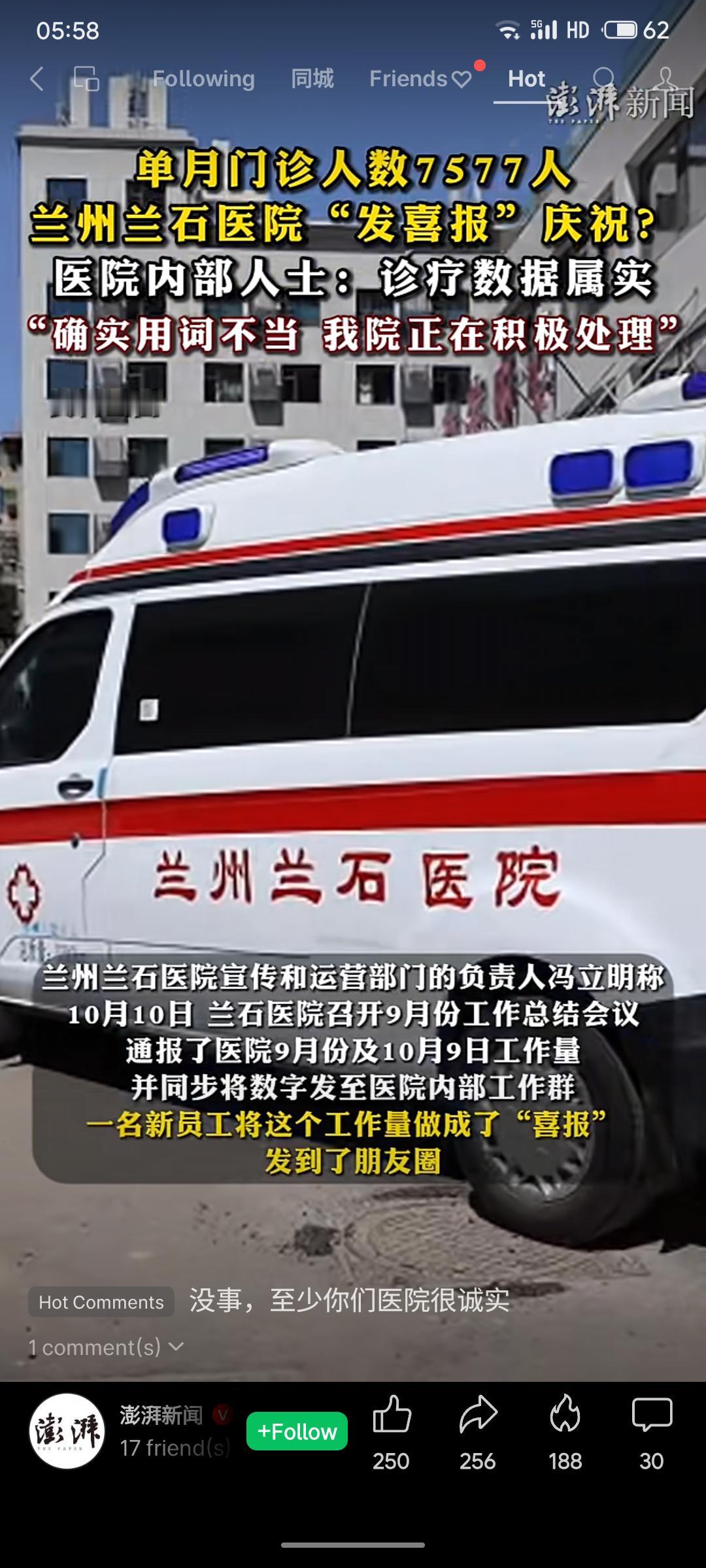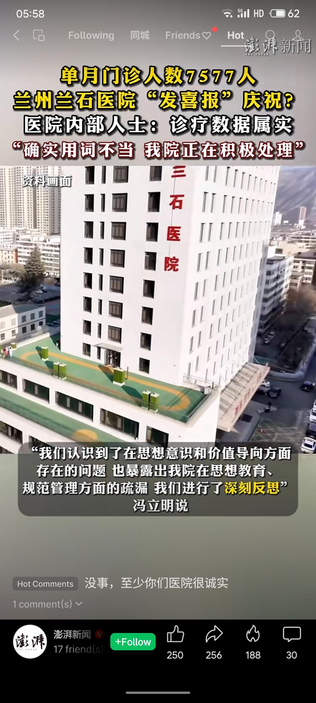 兰州兰石医院因发布“喜报”,庆祝9月门诊量达7577人次及手术量增长而引发争议。院方随后回应,确认数据属实但承认用词不当,并解释该图片系新员工制作后误发至朋友圈。医院已对此事进行深刻反思,承认存在价值导向和管理疏漏。