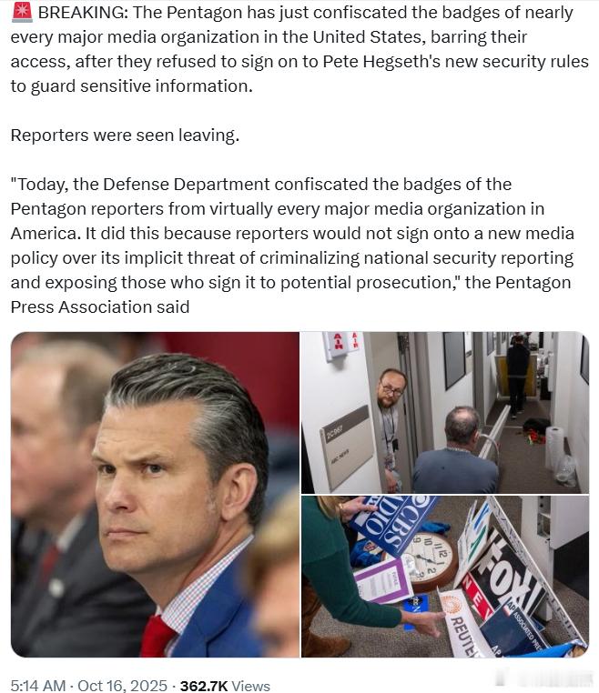 五角大楼刚刚没收了几乎所有美国主要媒体机构记者的通行证,禁止他们进入五角大楼,因为这些记者拒绝遵守皮特·海格塞斯推出的新安全规定,以保护敏感信息。